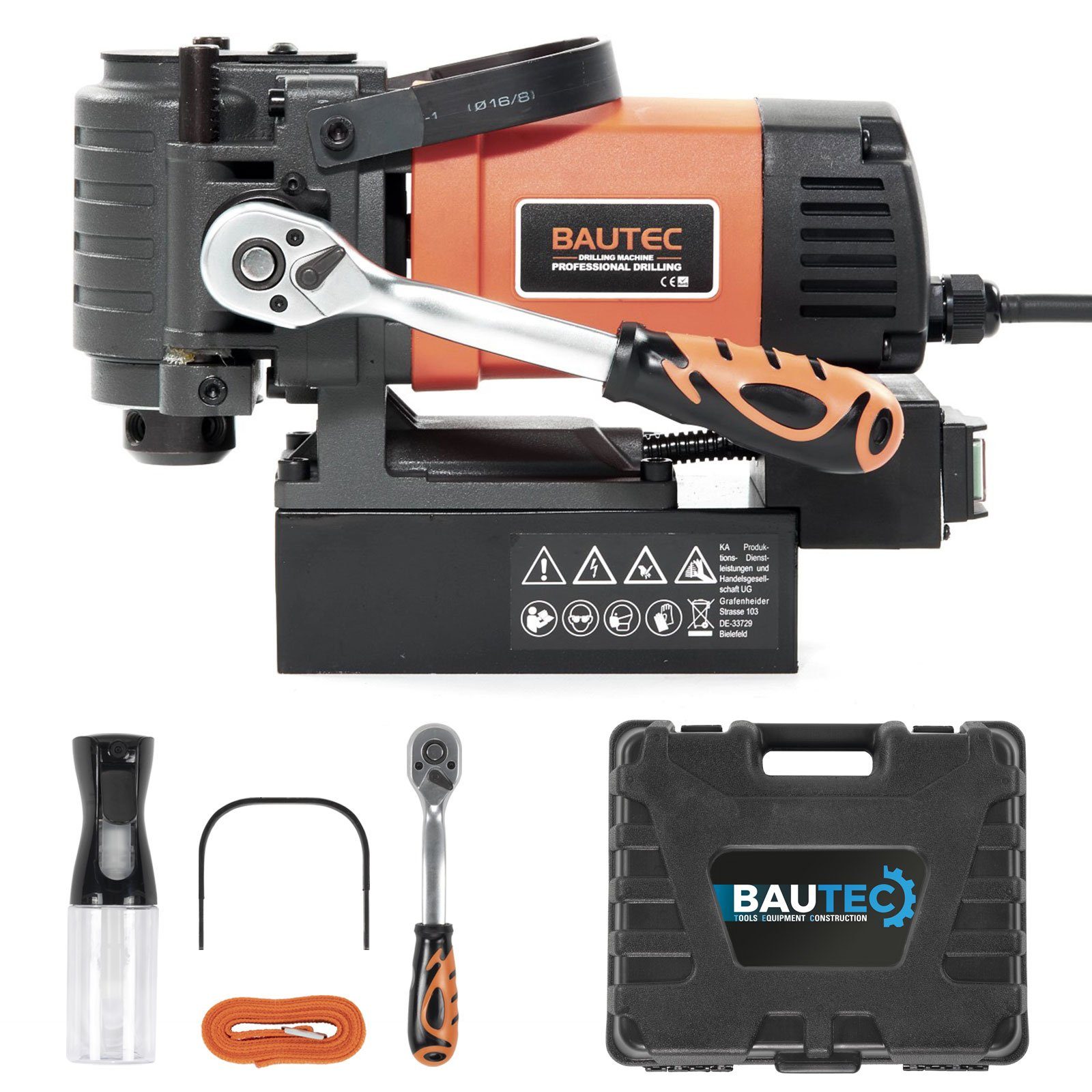 Lieferumfang | 1x Magnet-Kernbohrmaschine mit Handgriff; 1x Knarre/Ratsche für Hubbewegung (rechts und links verwendbar); 1x Innensechskantschlüssel; 1x Sprühflasche für Kühlmittel; 1x Sicherheitsgurt; 1x Handbuch; 1x Transportkoffer |