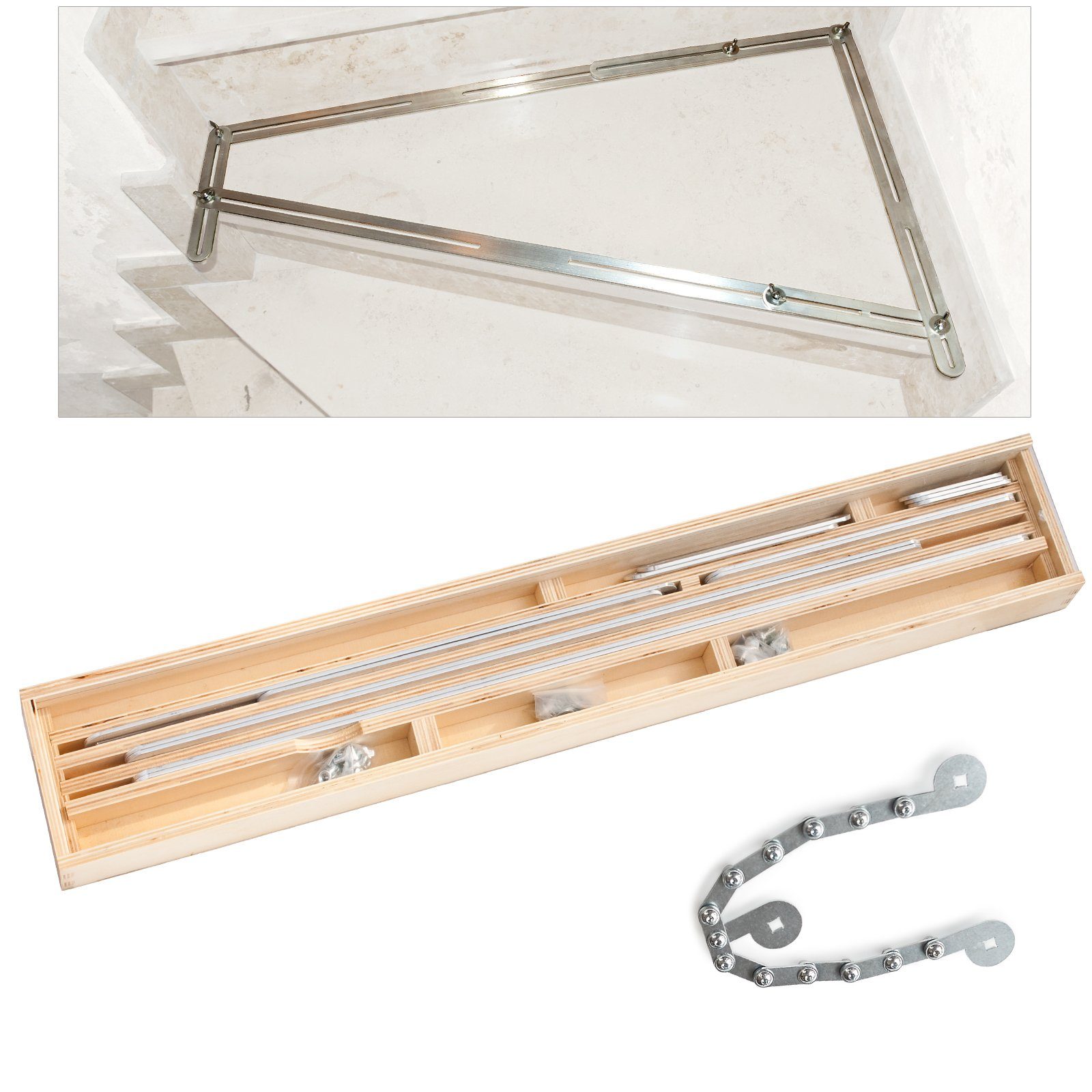 Mit der Treppenlehre können vieleckigen Konturen (wie z.B. Treppenstufen) nachgebildet und auf ein Werkstück übertragen werden. Nahezu fast jede Kontur und Form kann mit den Aluschienen erstellt werden. Dank dem zusätzlichen Element für Rundungen können auch Rundungen bei Treppenstufen ganz einfach abgemessen und übertragen werden.
