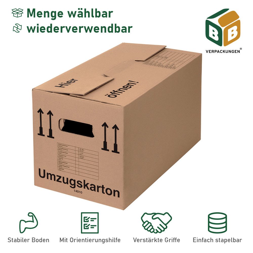 Unsere Umzugskartons von BB-Verpackungen zeichnen sich durch einige besondere Merkmale aus. Die hochwertige zweiwellige Wellpappe und der doppelte Schmetterlingsboden bieten eine außergewöhnliche Stabilität, selbst bei schweren Lasten. Zusätzlich sind sie umweltfreundlich, da sie zu 100 % recyclebar sind, und bieten dank ihrer Qualität eine lange Lebensdauer. Die 3-fache Griffverstärkung und das praktische Beschriftungsfeld sorgen für zusätzlichen Komfort und Sicherheit während des Umzugs, indem sie Organisation und schnelles Auffinden erleichtern.