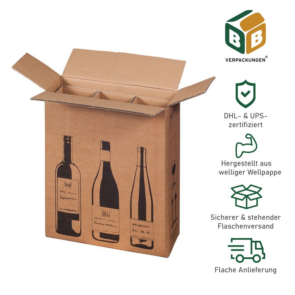 Unser Flaschenversandkarton ermöglicht Ihnen einen sicheren und problemlosen Transport dank der PTZ-Zulassung und DHL Zertifizierung. Unser Flaschenversandkarton ist für folgende Flaschentypen geprüft: Schlegel 0,75l und 1l, 0,75l Bordeaux, Burgunder, Sekt/Champagner. Der Flaschenversandkarton wird flach angeliefert und ist einfach zusammenzubauen