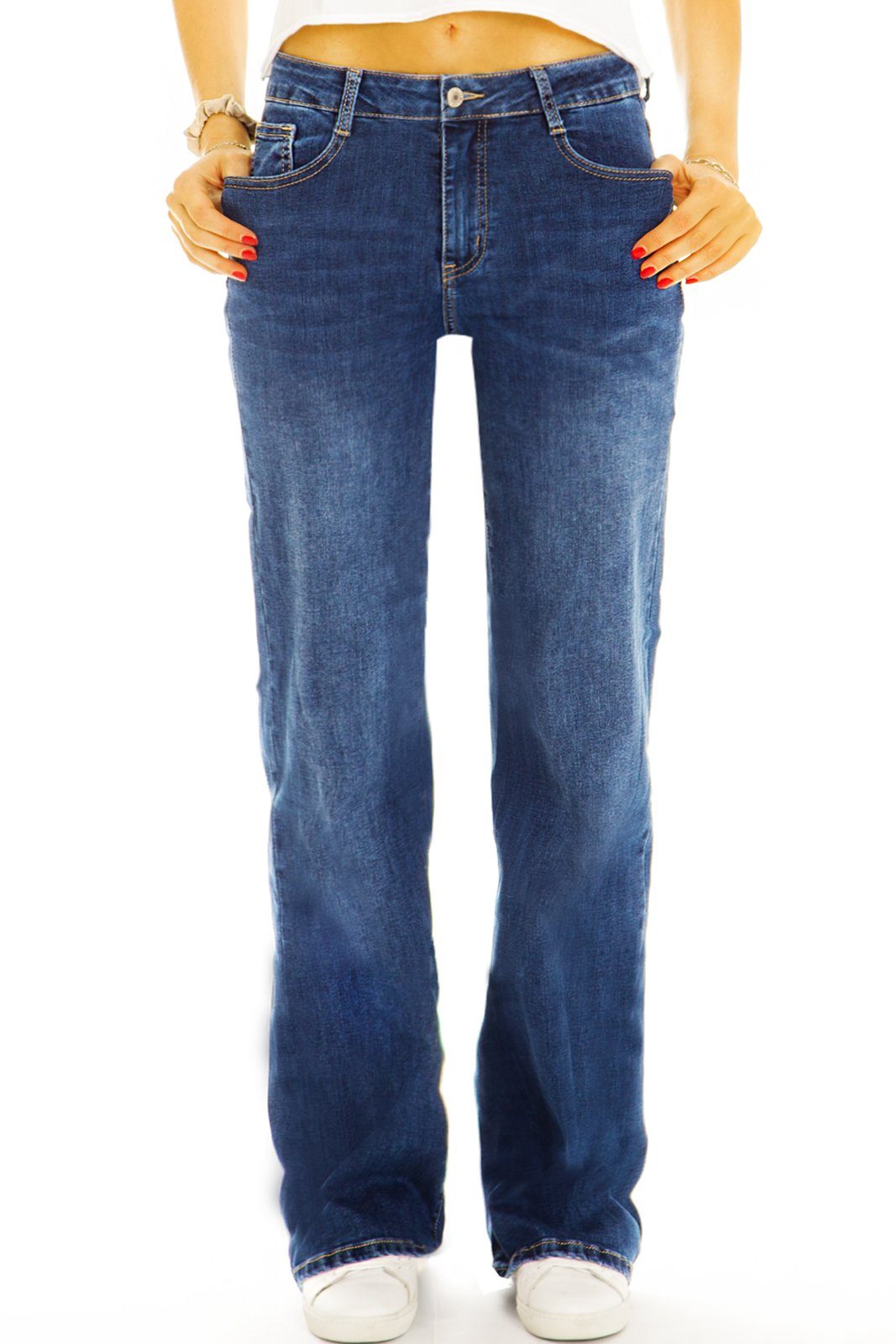 Immer im Trend und wird so schnell nicht aus der Mode kommen - die medium waist Damen Jeanshose mit weitem Bein. Super bequem und perfekt zu kombinieren, wird dich die Jeanshose für Mädchen mit ausgestelltem Bein sofort überzeugen. Der angenehme Materialmix besteht aus 70% Baumwolle, 28% Polyester und 2% Elasthan und sorgt so für einen Power-Stretch der Damen Jeans Hose mit normal hoher Leibhöhe. Der 5 Pocket Style unterstreicht den trendigen Basic Look der Jeanshose für Damen. Ob mit High Heels oder coolen Sneakern, diese günstige Basic Jeans für Frauen wirst du lieben. Erhältlich sind die Damen Хиты продаж Jeans in 34/XS, 36/S, 38/M, 40/L und 42/XL. Die gerade geschnittene Jeans Hose für Frauen besitzt bei Размер 36/S die folgenden Maßen: Die Innenbeinlänge beträgt ca. 78cm (bei allen Größen), die Beinbreite unten ca. 25cm, die Beinbreite oben ca. 26cm, die Leibhöhe ca. 27cm (alles bei Размер 36/S gemessen). Das Model trägt die Размер 36/S, bei einer Körpergröße von 171cm, einem Hüftumfang von 89cm und einem Taillenumfang von 59cm. Wie wir messen: Um für dich die richtige Размер zu finden, legst Du eine deiner Hosen glatt auf eine ebene Fläche. Die Innenbeinlänge misst man von Schritt bis Saum. Bei der Leibhöhe wird der Abstand zwischen Bund und Schritt gemessen. Die Beinbreite oben, misst du am Besten an der breitesten Stelle des Hosenbeins. Die Saumbreite entspricht der Hosenbeinbreite ganz unten. Die Ширина пояса entspricht der einfachen von links nach rechts gemessenen Weite des Hosenbundes. Anschließend vergleichst du die Maße deiner Hose mit denen von uns in der Beschreibung angegebenen Maßen. Diese Jeans fällt regulär aus.