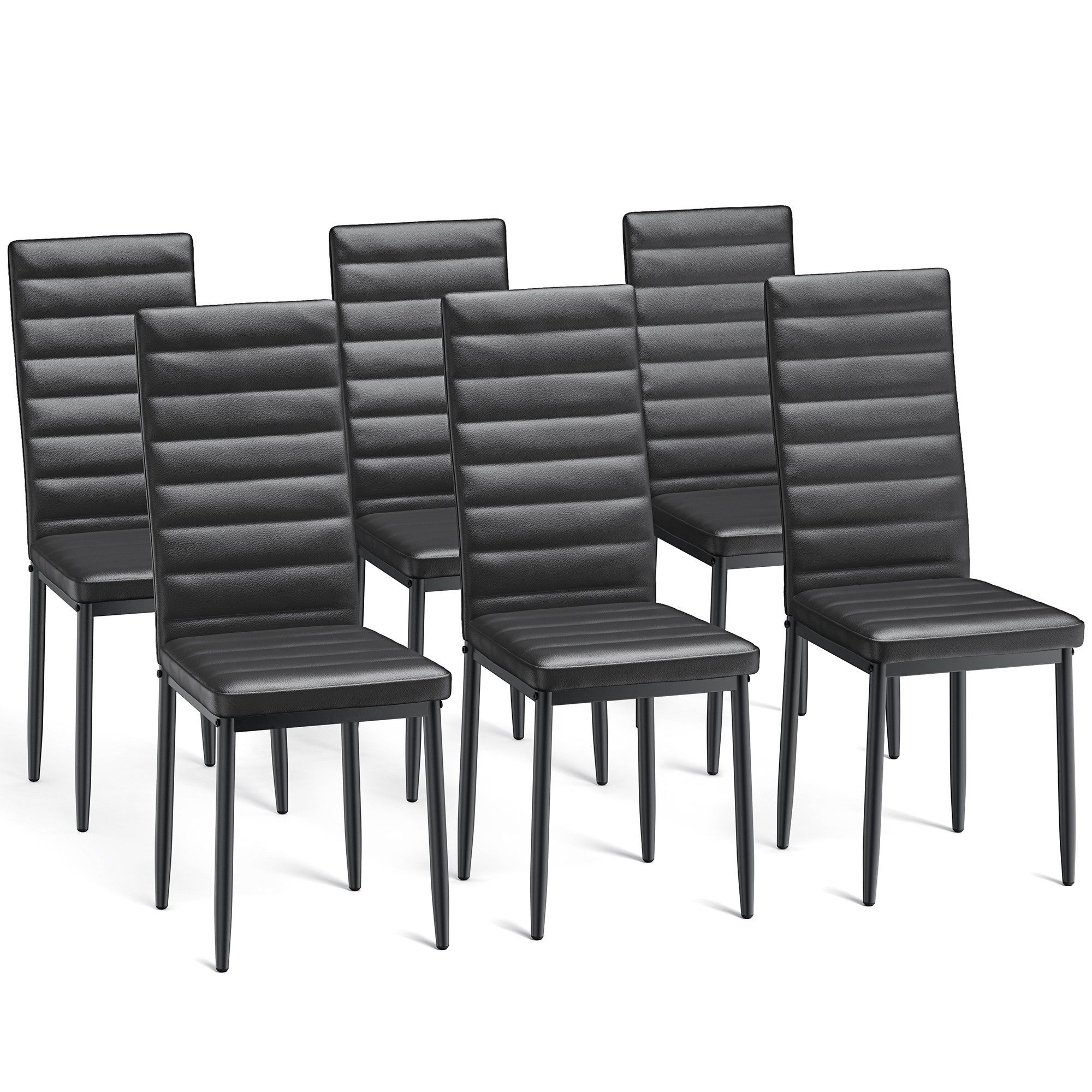 Ob für den täglichen Gebrauch zu Hause oder für kleine Zusammenkünfte, dieses vierteilige Esszimmerset kann Ihre ideale Wahl sein. Jedes Teil verfügt über ein festes Modell, um strukturelle Stabilität zu gewährleisten und eignet sich für verschiedene Orte wie Esszimmer, Wohnzimmer, Küchen und Konferenzräume. Die wasserdichte Kunstlederoberfläche ist pflegeleicht und die mit Polyester gefüllte Sitzfläche ist bequem und atmungsaktiv, sodass Sie auch über längere Zeiträume bequem sitzen können. Jeder Stuhl hat eine gute Größe, eine Tragfähigkeit von 150 kg und ist an der Unterseite mit 4 rutschfesten Spitzen ausgestattet, um ein Verkratzen des Bodens zu vermeiden. Durch das geräuscharme Design können Sie beim Umzug eine ruhige Essumgebung genießen. Durch die sorgfältige Berücksichtigung des ergonomischen Designs können Sie eine angenehme Partyzeit genießen