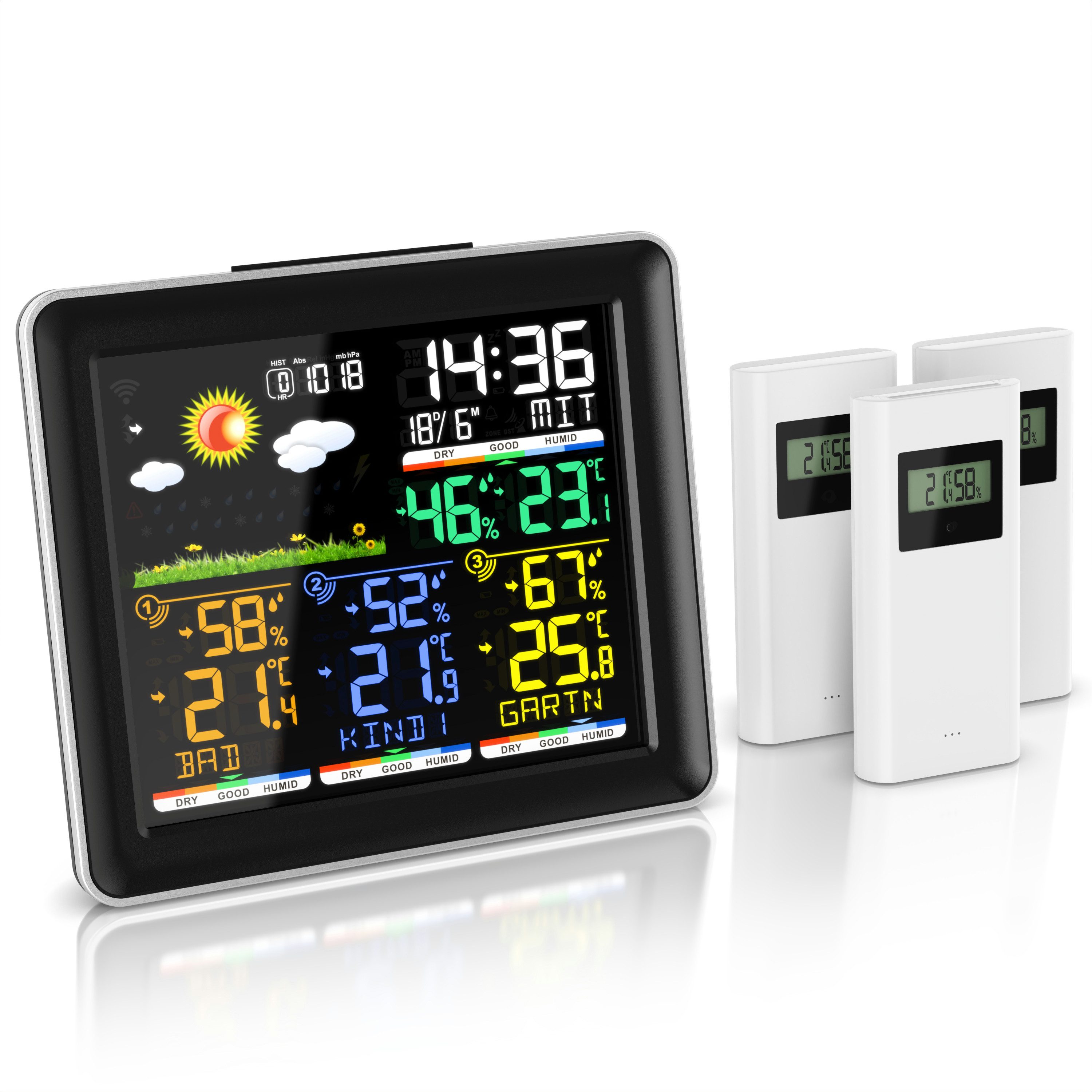 Die moderne DCF-Wetterstation bietet ein großes Farbdisplay mit genauen Angaben zu Innen- und Außentemperatur, Luftfeuchtigkeit und Luftdruck. Sie zeigt eine Wettervorhersage mit sieben Symbolen und nutzt drei Außensensoren für flexible Messungen. TrendОтзывы, einstellbare Hintergrundbeleuchtung sowie Datum, Uhrzeit und Weckfunktion mit Schlummermodus machen sie besonders vielseitig.