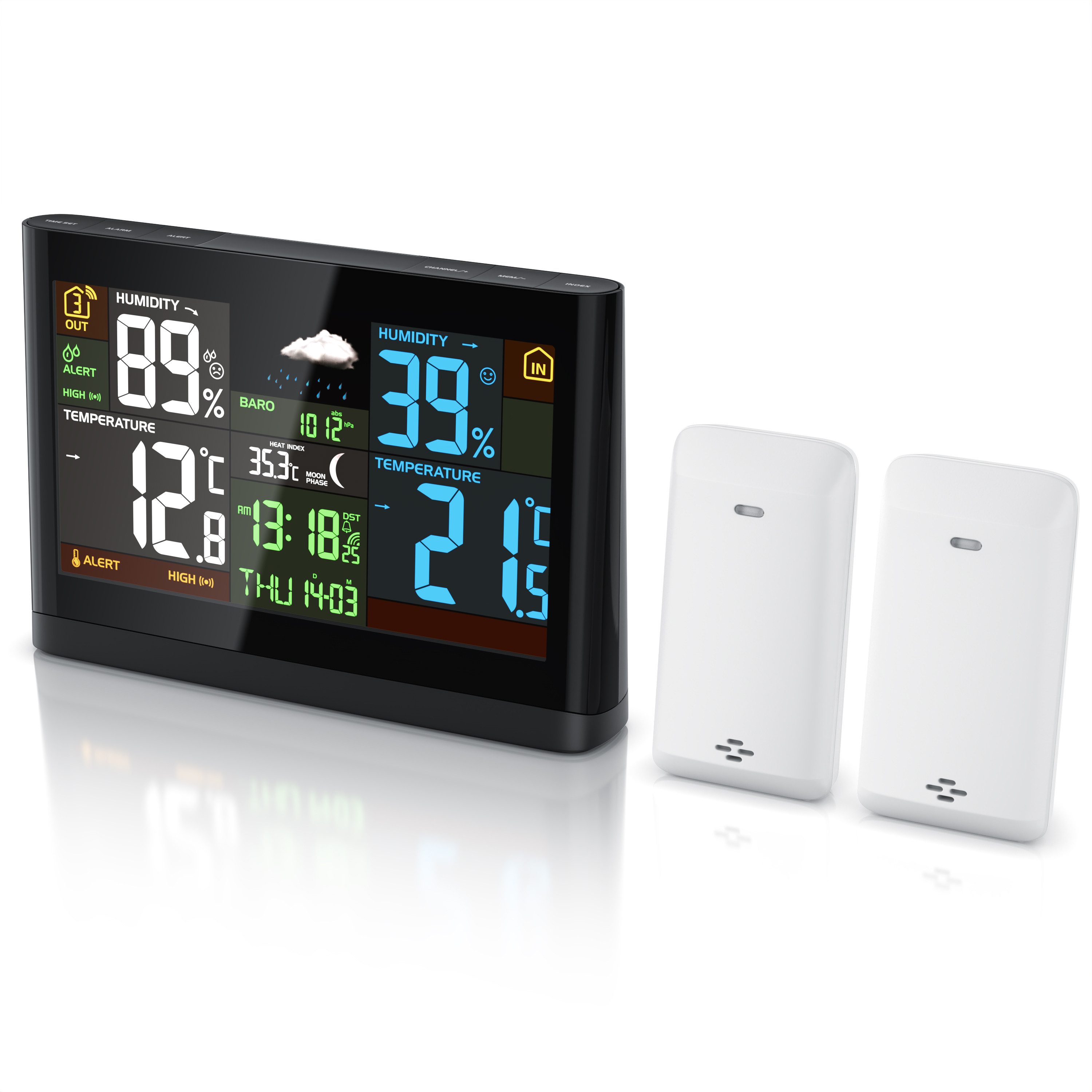 Ausstattung | Farbdisplay Dual-Weckfunktion DCF-Empfänger Min/Max-Funktion Temperaturalarm Mondphase Barometer Wandhalterung |