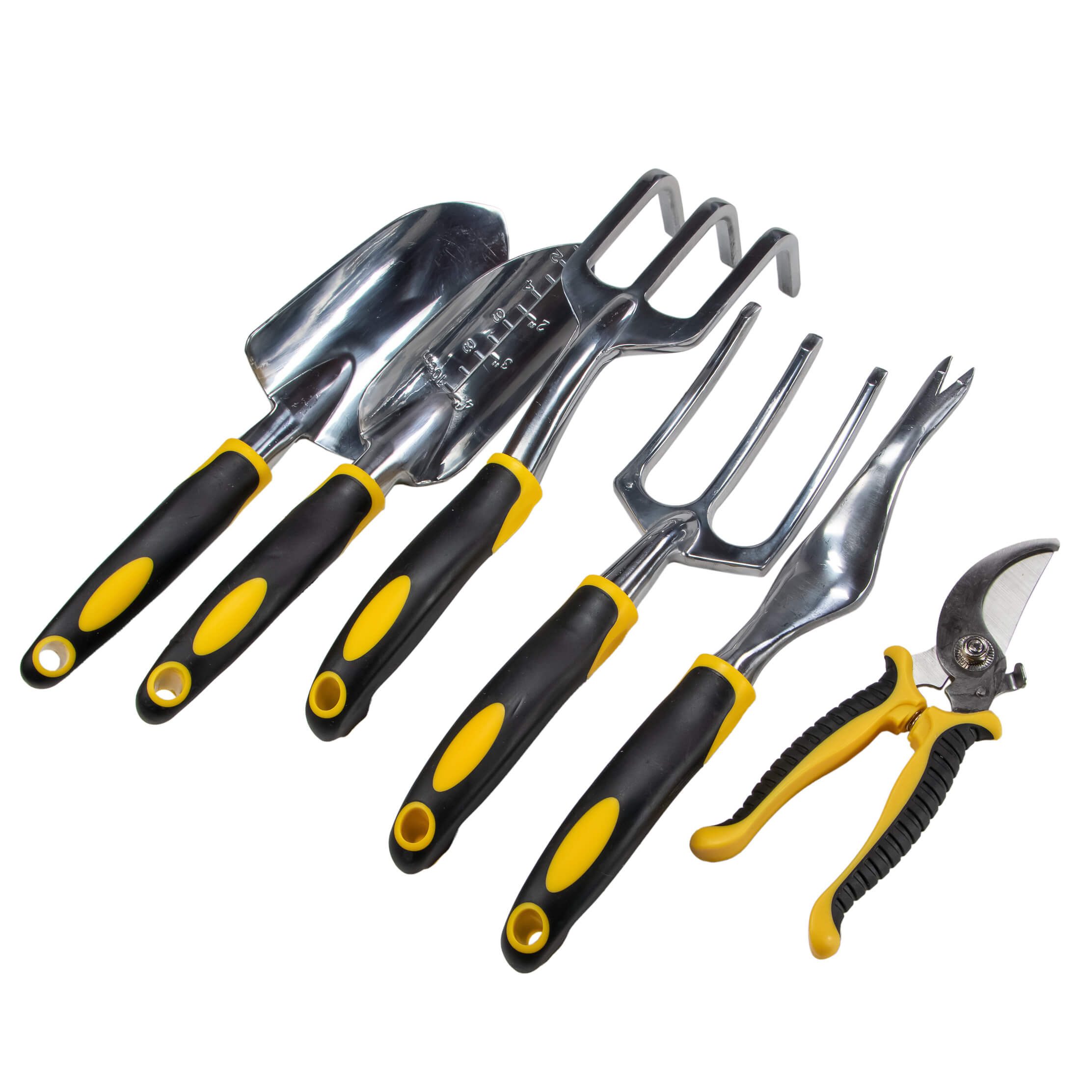Die Bodenschaufel eignet sich ideal zum Graben, die Kelle zum Umpflanzen, der Kultivator zum Lockern des Bodens, die Handharke zum Jäten, die Gartenschere zum Beschneiden und der Unkrautstecher zum Entfernen lästiger Unkräuter.
