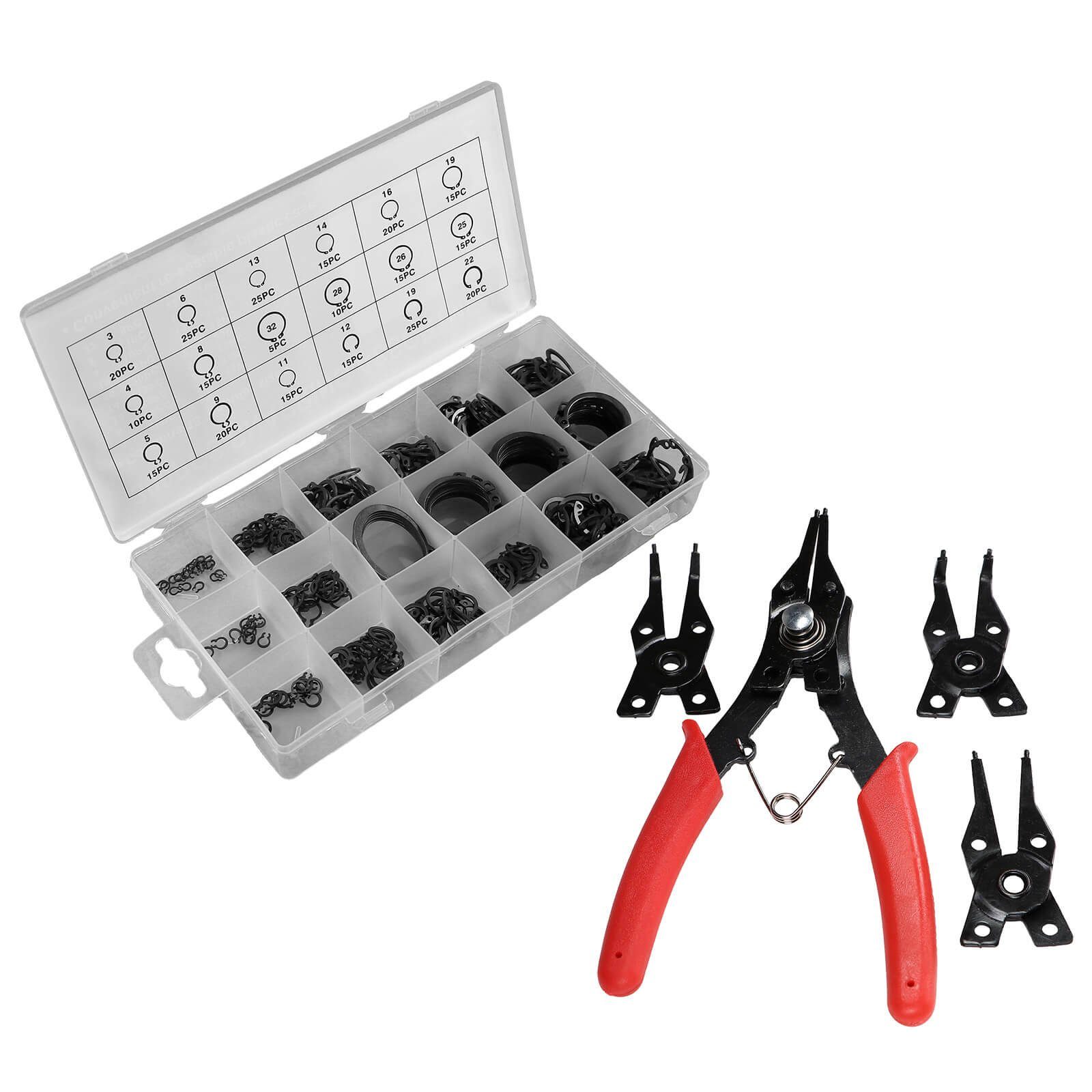 Die Seegeringzange ist geeignet zum Ein- und Ausbau von Innen- wie Außensicherungsringen. Im Set sind neben der Zange vier Wechselaufsätze (gerade, 45 Grad und 90 Grad abgewinkelt) sowie ein 300 teiliges Wellensicherungsringe Меню enthalten.