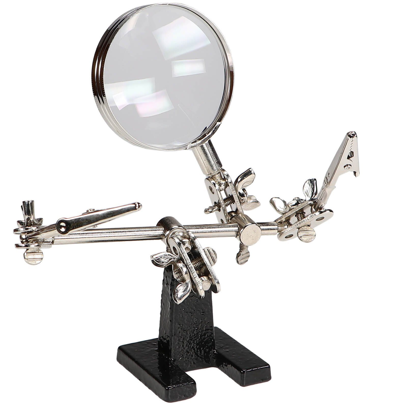 Idealer Helfer zum Löten und Basteln. Ditte Hand mit Lupe und verstellbaren Krokoklemmen. Die Krokoklemmen halten kleine Bauteile, Plantinen, Kabel etc. . Sauberes Löten durch die Lupe mit Glaslinse.
