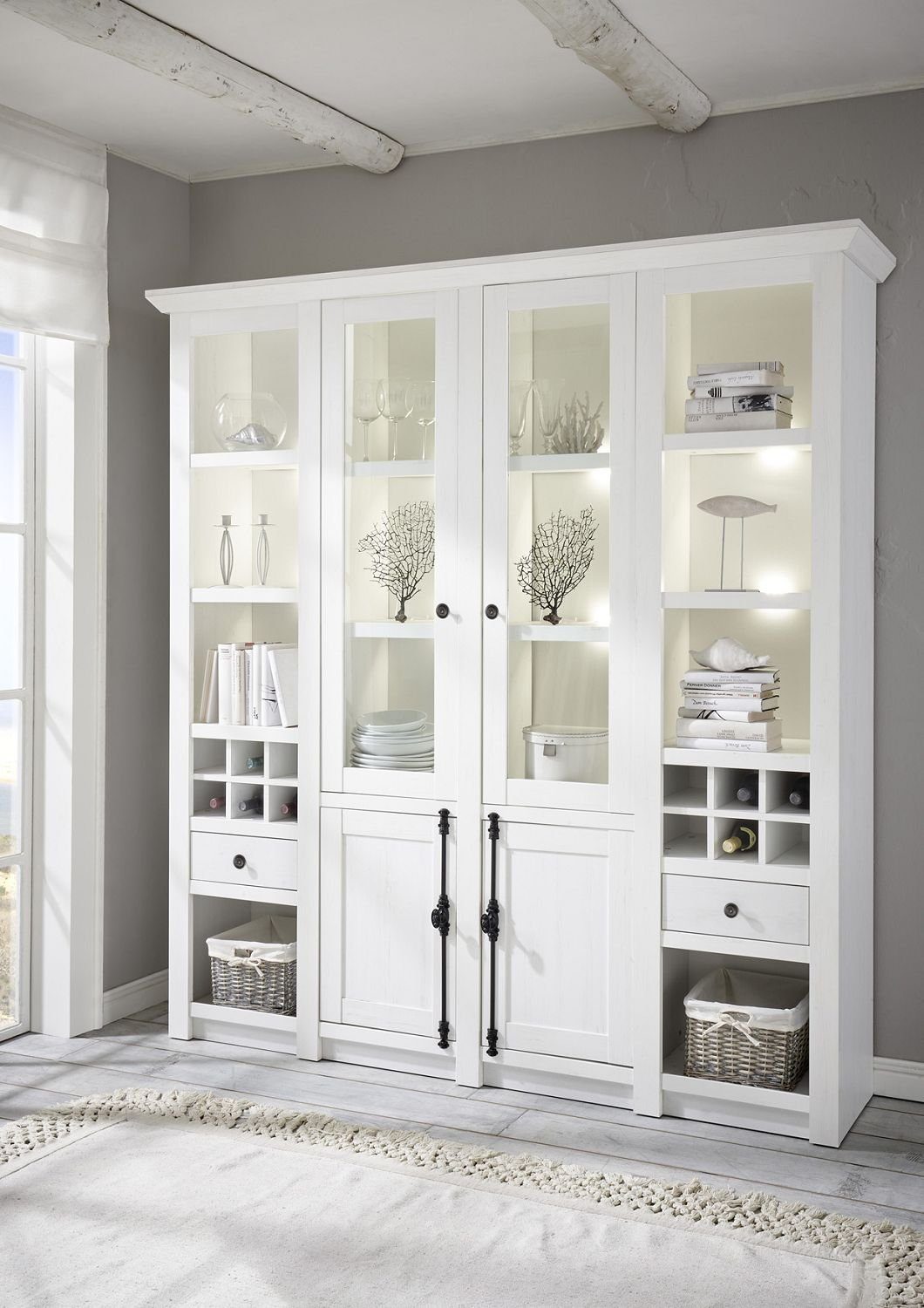 Der große Buffetschrank "Feres" im angesagten Landhaus Stil. Das romantische Design schenkt Ihrem Wohnraum ein harmonisches und gemütliches Ambiente. Unterstrichen wird der elegante Landhausstil durch die zarte Farbgebung in einer Pinie weiß Nachbildung. Die Griffe aus Metall bilden dabei einen passenden Kontrast zu den zarten hellen Tönen. Ein anmutiges und stimmiges Erscheinungsbild für Ihr Zuhause. Die beiden Doppeltüren mit Glaseinsätzen bieten einen schönen Einblick auf die dahinter gelegenen Einlegeböden. Darunter befindet sich zwei Schränke mit je einem Einlegeboden. Ein besonderes Highlight sind dabei die Drehstabverschlüsse. Dieser wirkt sehr hochwertig und unterstreicht das Gesamtbild. Der Buffektschrank bietet zwei symmetrische seitliche Regalelemente, mit zwei Einlegeböden, je einer Schublade, eine offene Ablage im unteren Bereich und einem Flaschenabteil. Ihre Büchersammlung, Familienfotos oder Souvenirs finden in diesem Schrank genug Austellungsraum um bewundert zu werden. Für ein optimale Präsentation und für ein gemütliches Ambiente empfehlen wir eine Rückwandbeleuchtung. Sie schenkt eine schöne, weiche und indirekte Beleuchtung. Ein naturverbundenes und ländliches Design mit einem Hauch von Luxus.