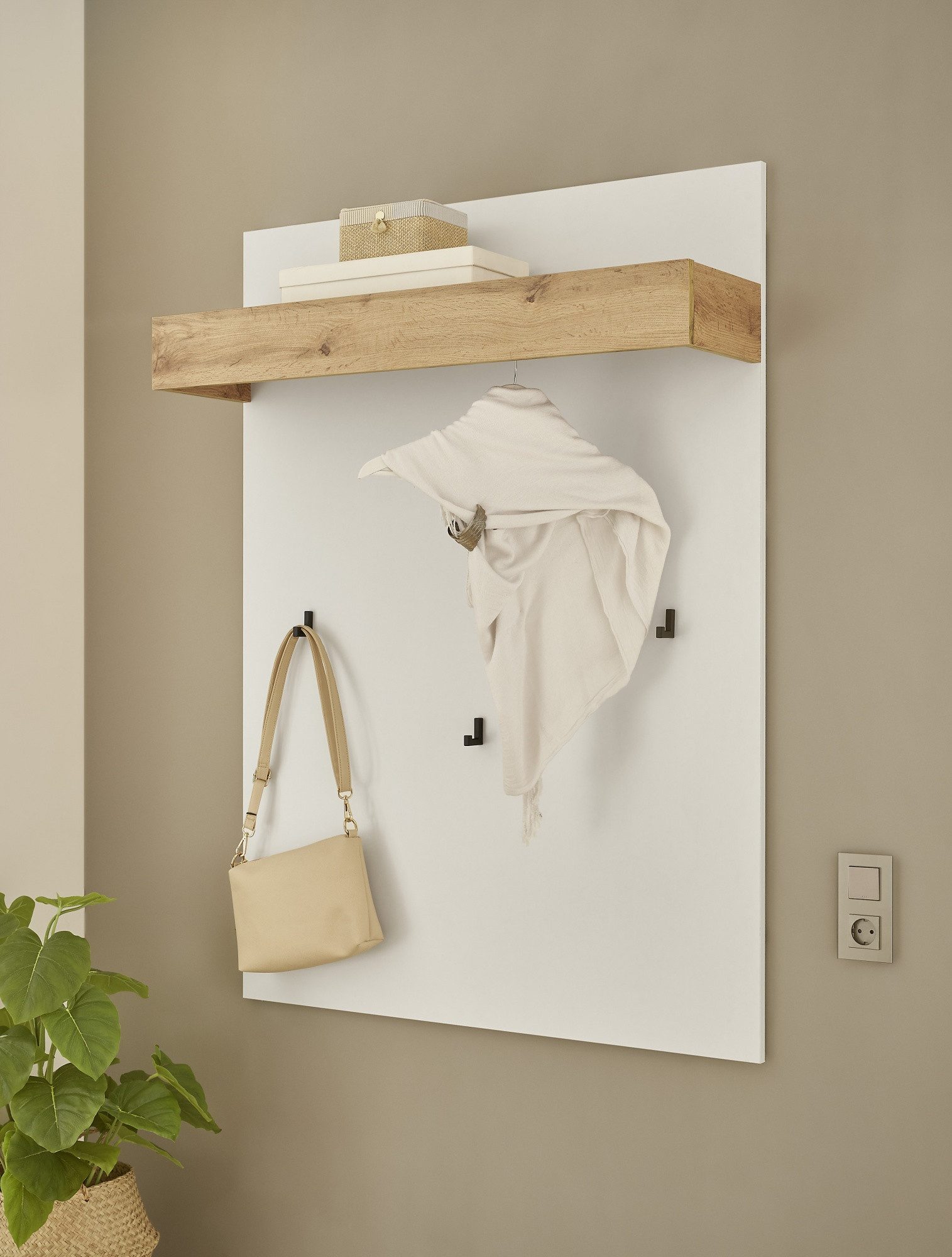 Das Garderobenpaneel „Style“ verbindet modernes Design mit funktionaler Ausstattung. Die Kombination aus weißfarbenem Korpus und warmem Wotan Eiche Dekor setzt stilvolle Akzente in Ihrem Eingangsbereich. Dank Hutboden, Garderobenstange und drei Haken haben Sie Jacken, Schals und Taschen immer griffbereit. Die offene Konstruktion sorgt für eine luftige Optik und passt perfekt in kleine wie große Flure.
