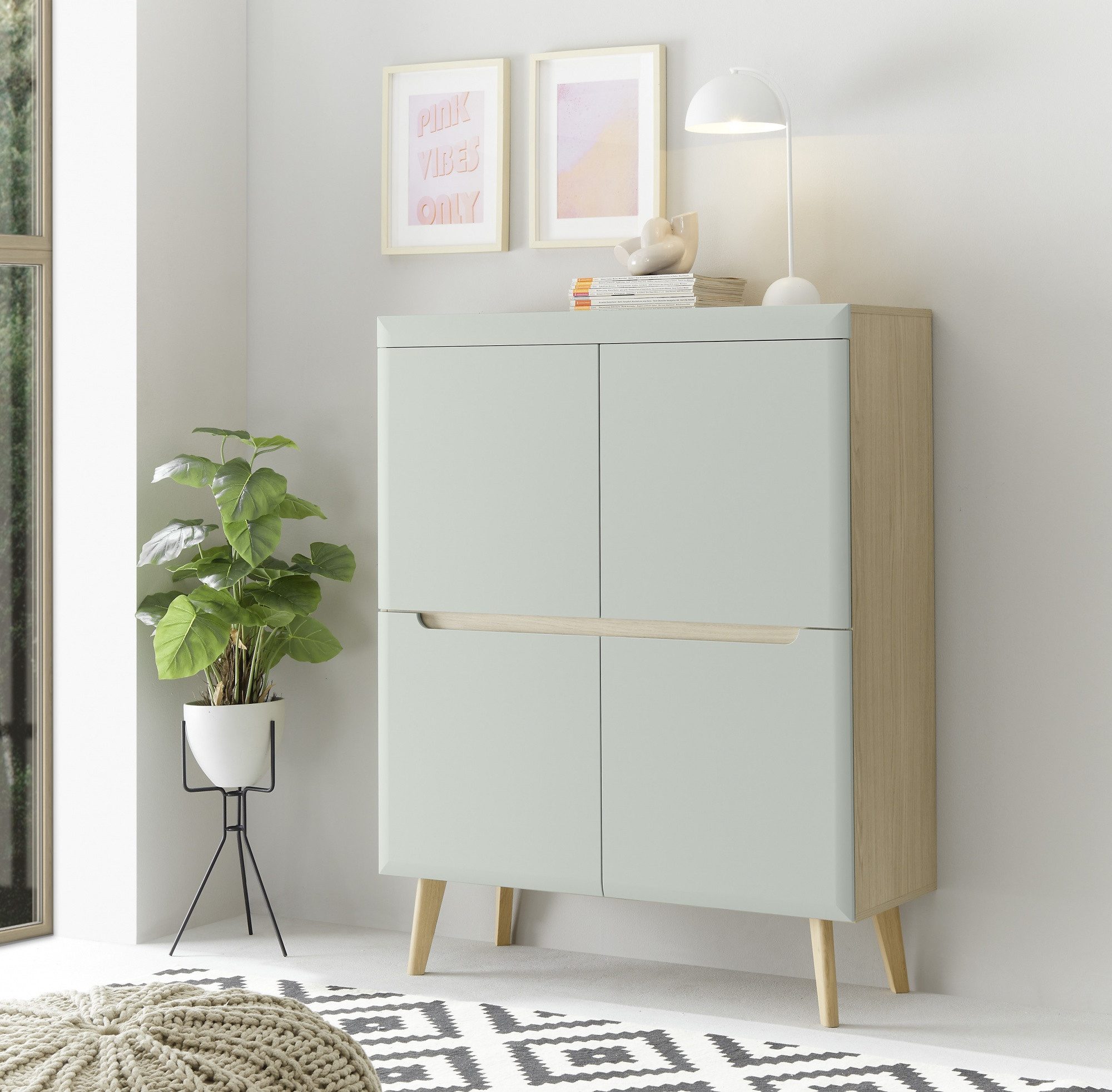 Das Highboard „Lumira“ überzeugt durch das warme Scandi Oak Dekor, das in jedem Raum eine natürliche und einladende Atmosphäre schafft. Die Pistachio Matt Front setzt einen sanften Farbakzent und unterstreicht das moderne Design. Die hochwertige Verarbeitung und die klaren Linien machen dieses Möbelstück zum Hingucker in jeder Einrichtung.