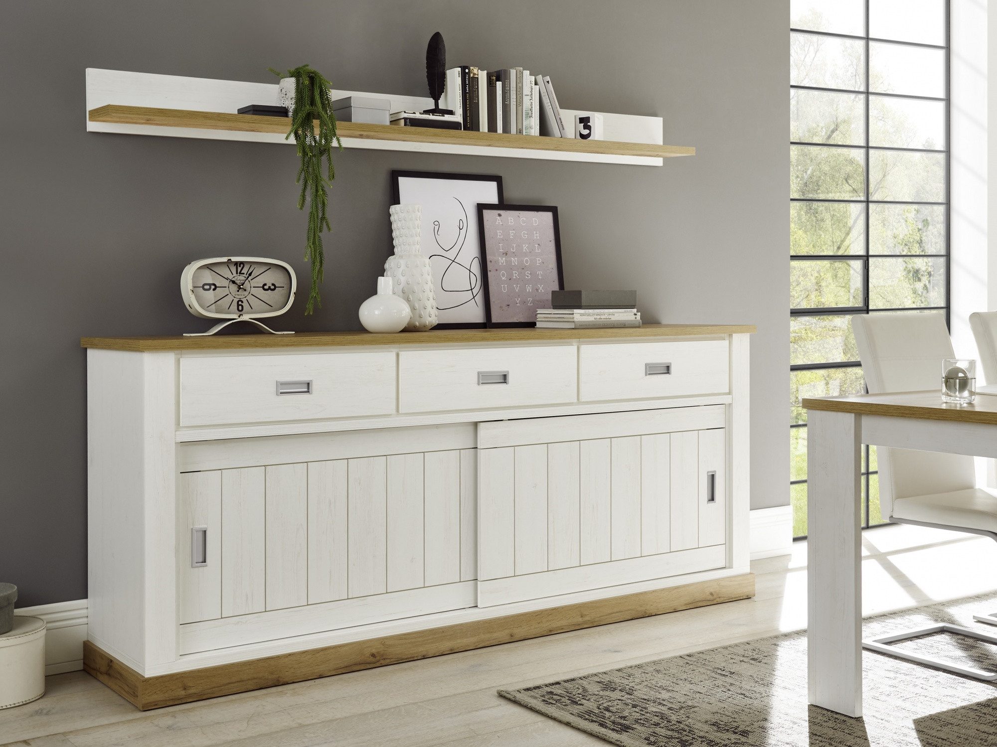 Design & Materialien: Das Sideboard "Hamptons" vereint ländlichen Charme mit modernen Akzenten und besticht durch sein elegantes Design. Der Korpus und die Front bestehen aus hochwertiger MDF-Platte im Pinie Weiß Dekor, das für eine helle und freundliche Atmosphäre sorgt. Die Applikationen im Wotan Eiche Dekor setzen warme, natürliche Akzente und verleihen dem Möbelstück eine einladende Optik.