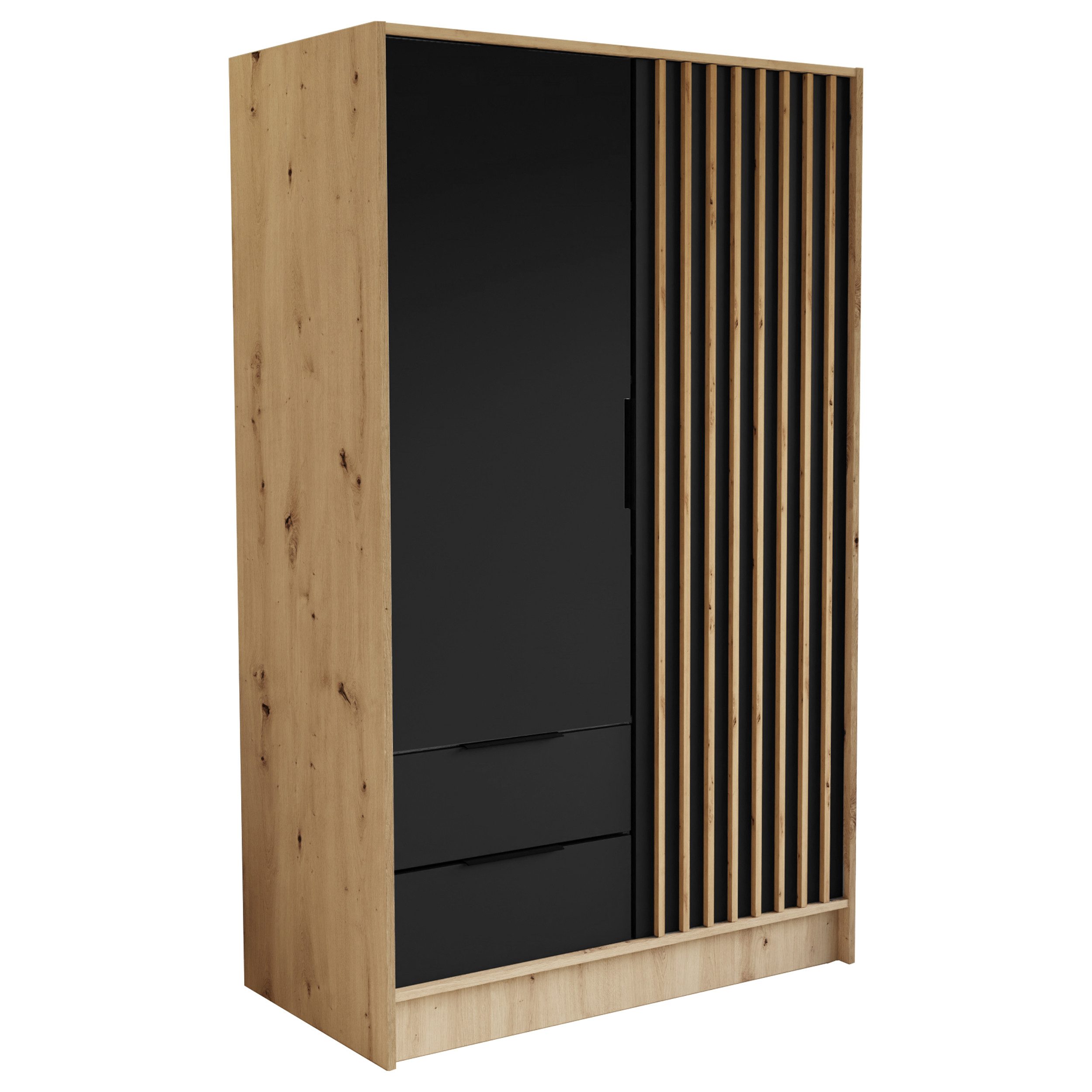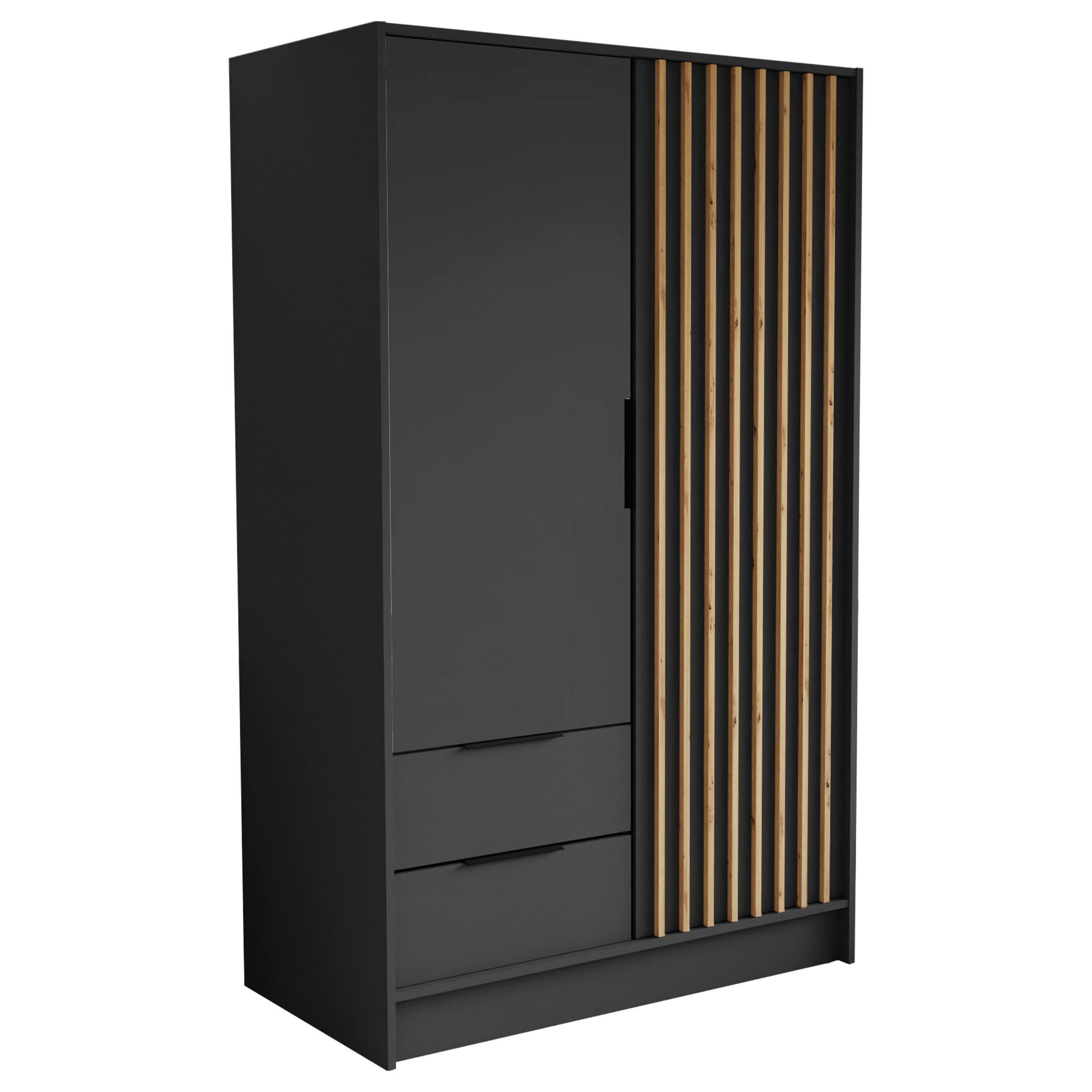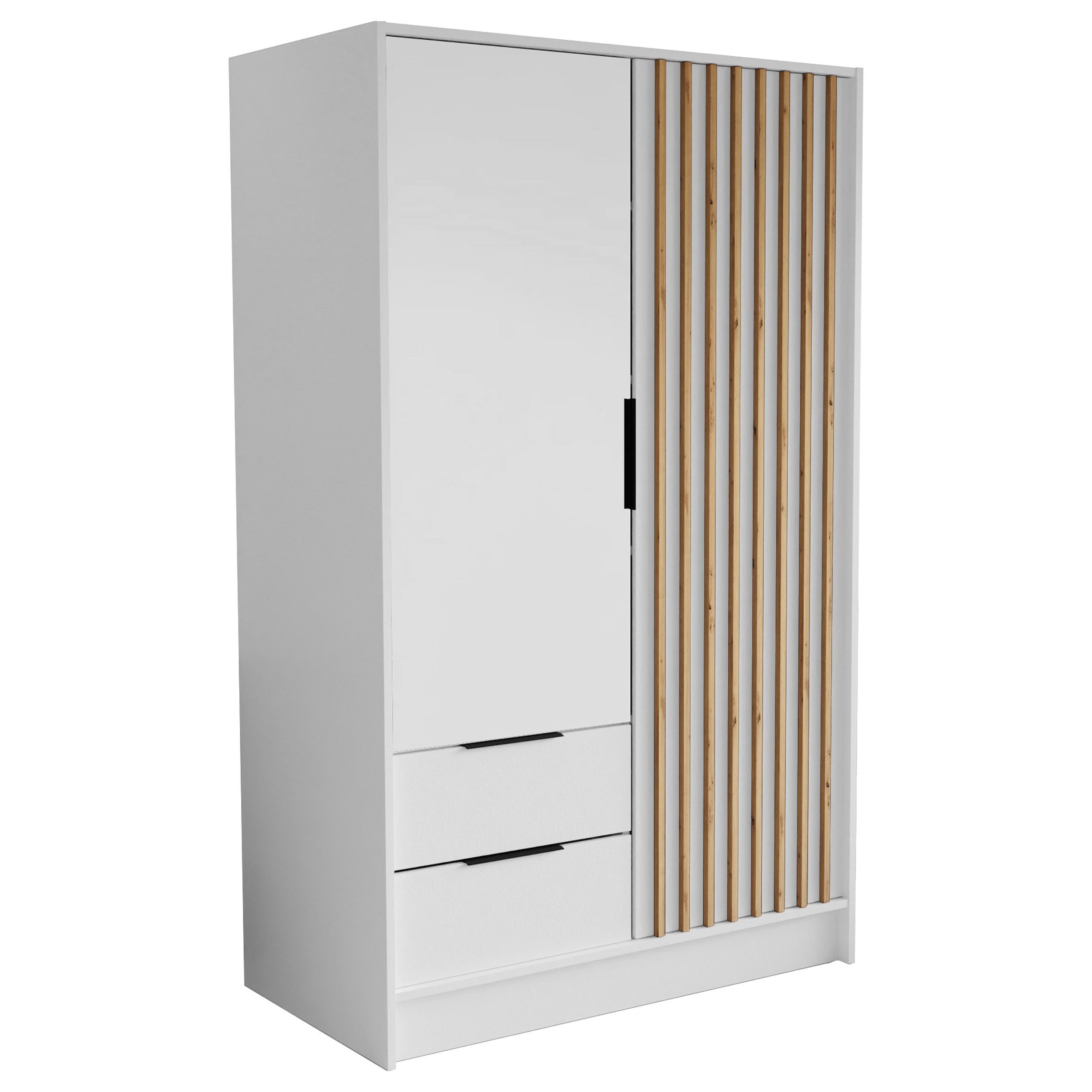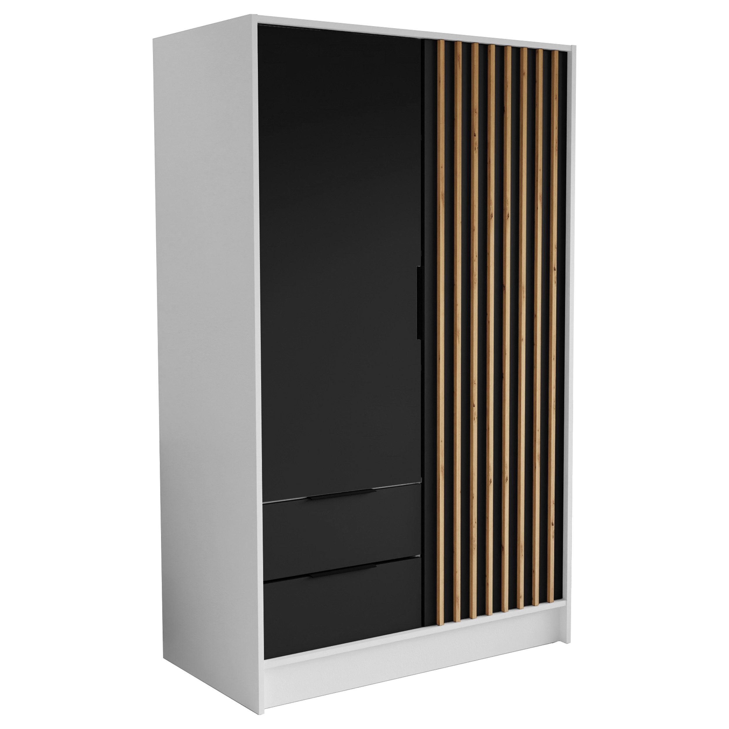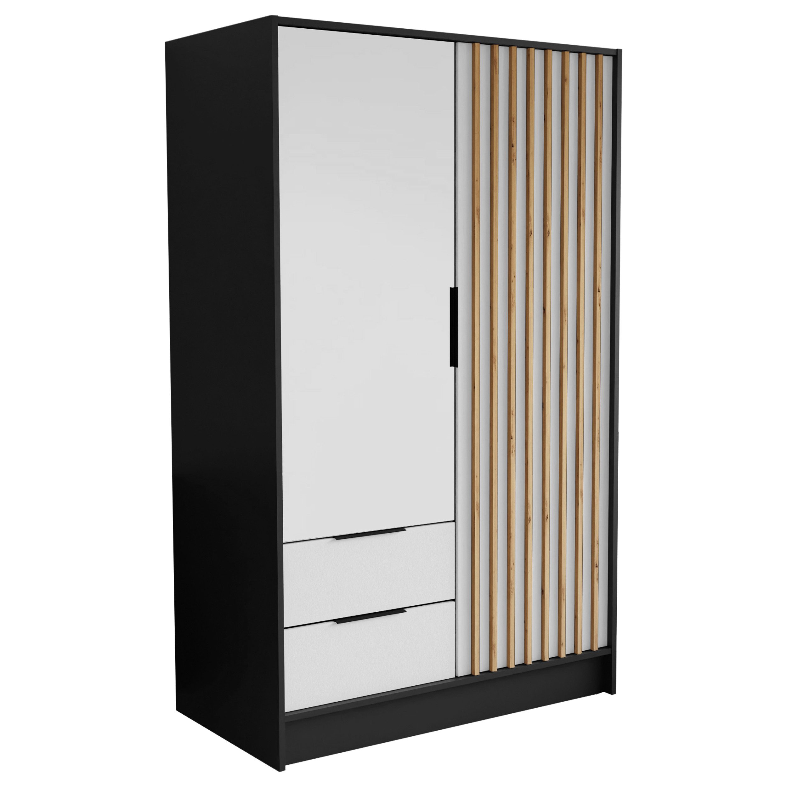 Intelligentes Innenleben: Das Innere des Kleiderschranks wurde sorgfältig entworfen, um eine Vielzahl von Aufbewahrungsbedürfnissen zu erfüllen. Zwei geräumige Schubladen, funktionale Einlegeböden und eine praktische Kleiderstange ermöglichen es Ihnen, Ihre Kleidung und Accessoires geschickt zu organisieren und aufzubewahren.