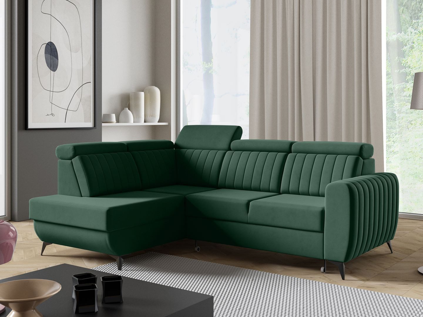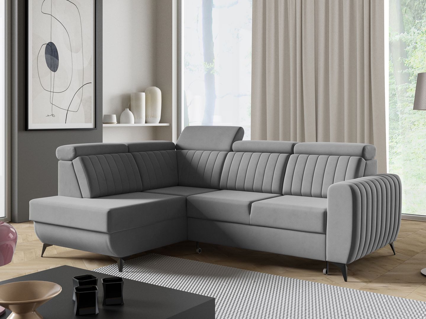 Das Ecksofa Connor II vereint funktionales Design, Glamour-Stil und höchsten Komfort. Es wurde entwickelt, um sowohl als elegantes Möbelstück als auch als praktisches Schlafsofa zu dienen. Mit nur wenigen Handgriffen lässt sich das Sofa mithilfe des präzisen Delfin-Mechanismus in ein bequemes Bett verwandeln – ideal für den täglichen Gebrauch oder als Gästebett.