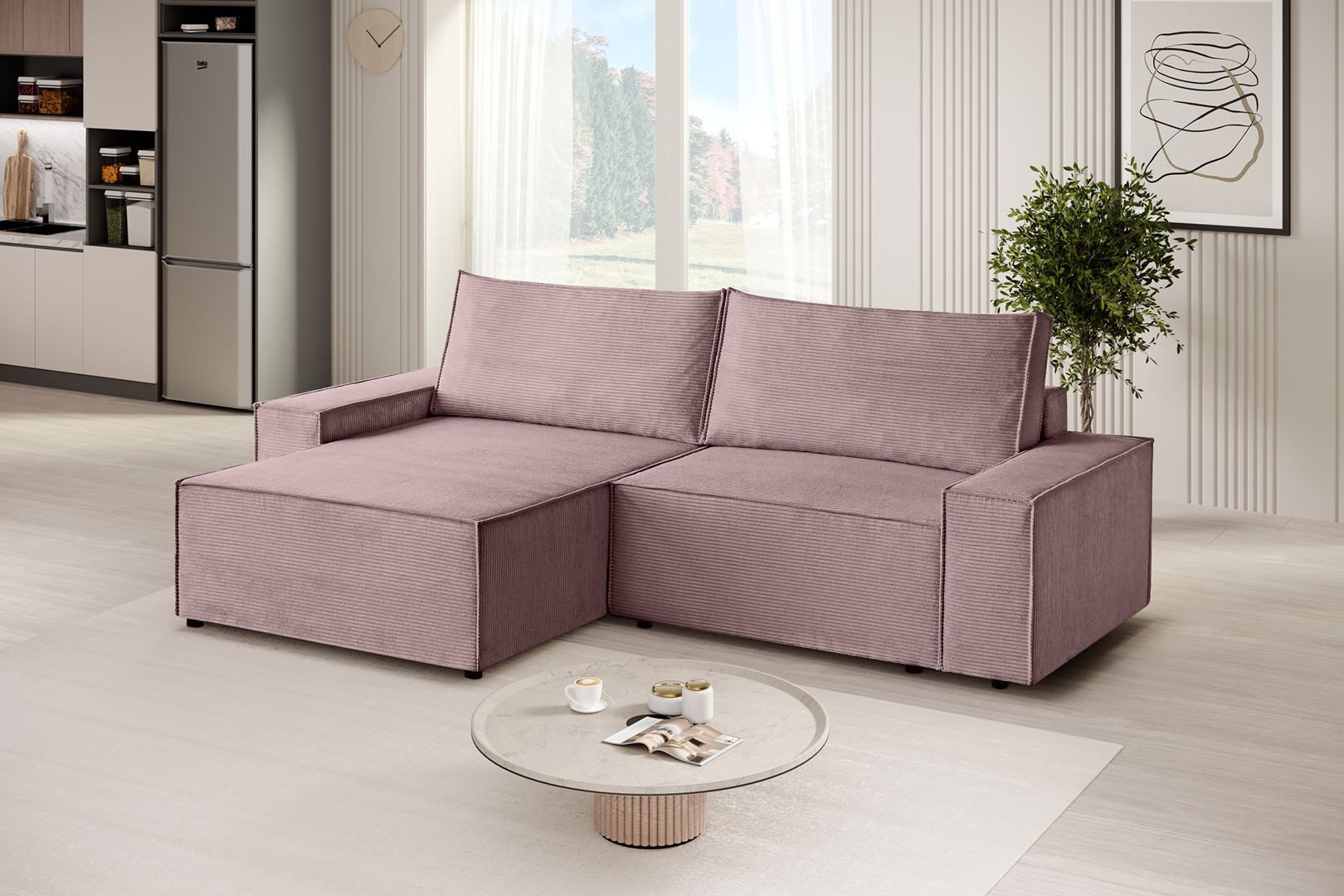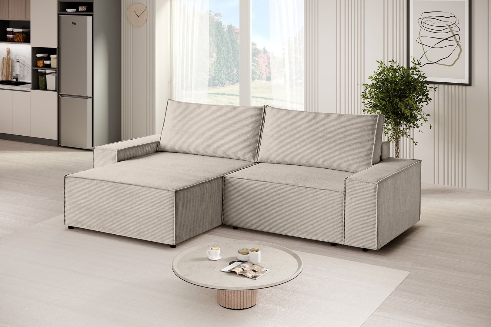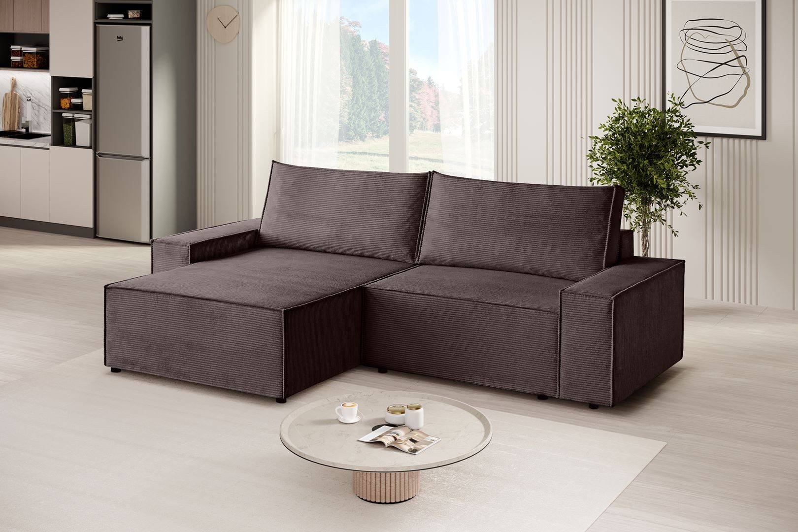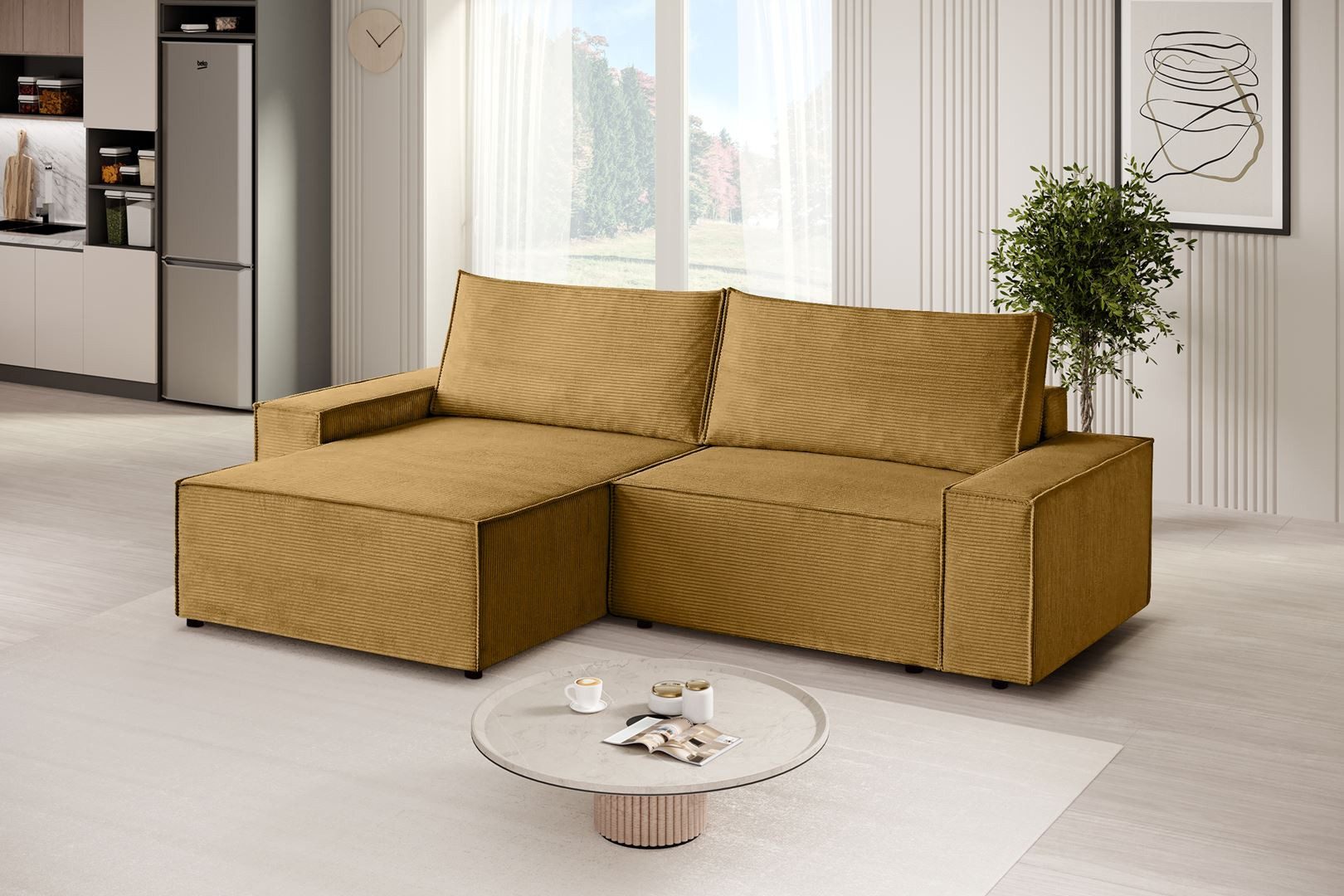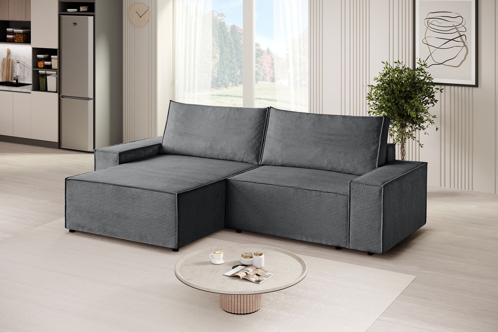 Wir stellen unser L-Form Ecksofa San Remo in luxuriösem Strux-Gewebe vor, das nicht nur außergewöhnlichen Komfort bietet, sondern auch Eleganz in Ihr Interieur bringt. Dieses Ecksofa aus Cordstoff San Remo ist eine Kombination aus Stil, Funktionalität und modernem Design. Die Schlaffunktion macht das Sofa zu einem vielseitigen Möbelstück, das sich sowohl für die tägliche Entspannung als auch für die nächtlichen Gäste eignet. Der innovative Mechanismus macht den Übergang vom Sitz zum Bett schnell und bequem, und zusätzlich, wenn Sie den versteckten Behälter öffnen, finden Sie genügend Platz für die Aufbewahrung von Bettwäsche oder Decken. Die Ecksofa mit universelle Ottomane San Remo fügt Arrangement-Flexibilität hinzu, so dass Sie das Sofa an eine Vielzahl von Raumlayouts anpassen können. Egal, ob Sie es auf der linken oder rechten Seite platzieren möchten, die Ottomane dient als zusätzlicher Sitz, Couchtisch oder Fußstütze und passt sich Ihren aktuellen Bedürfnissen an.
