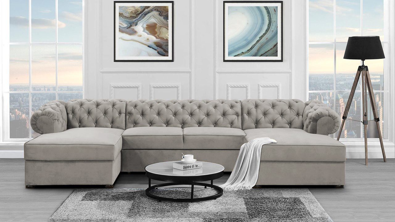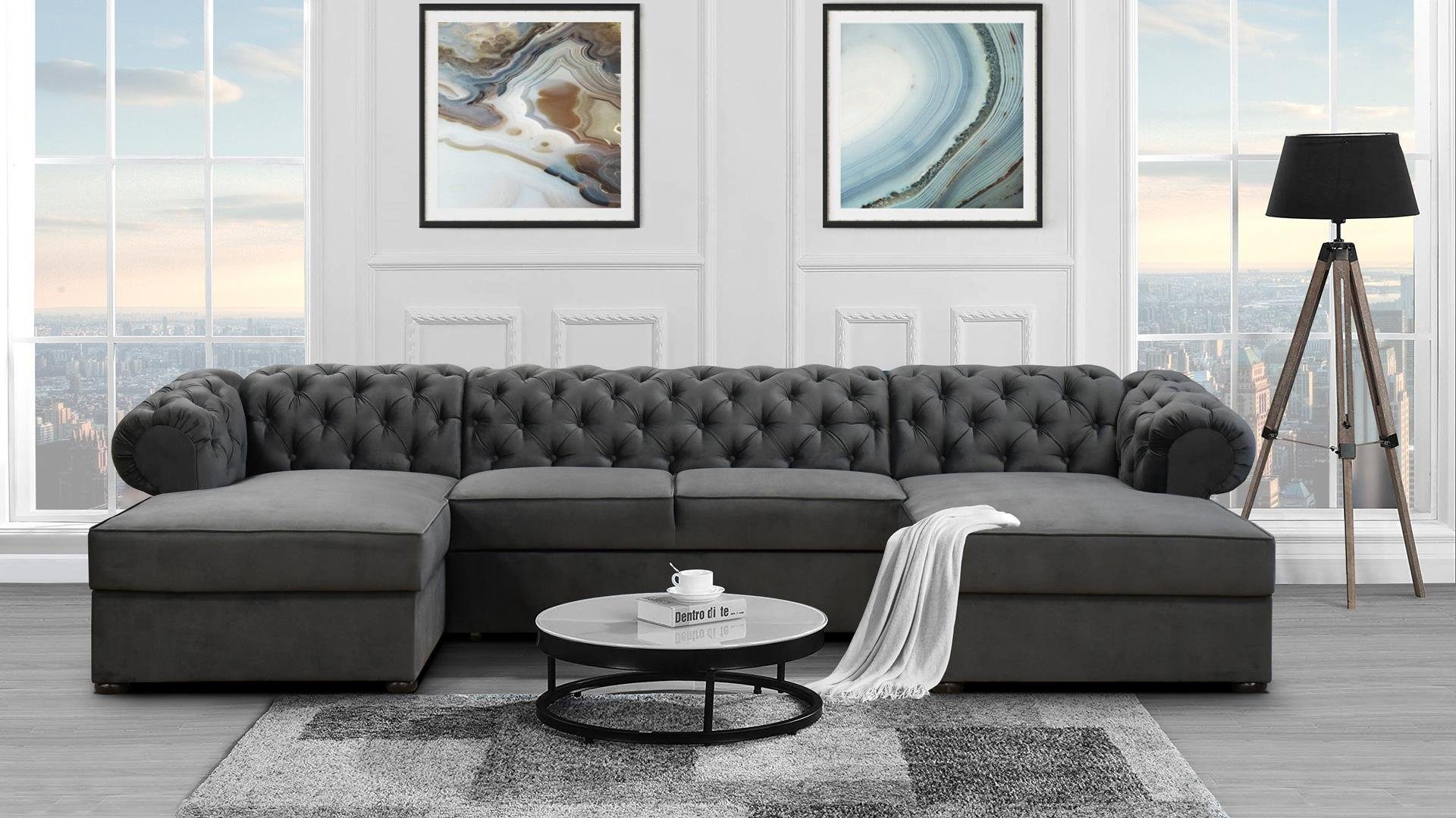 Mit der Delphin-Mechanismus verwandeln Sie das bequeme Ecksofa Chester U mit einer Liegefläche von 281 x 124 cm in einen bequemen Schlafplatz für die Nacht. Praktische Aufbewahrungsbehälter für Textilien bringen Ordnung in Ihr Wohnzimmer. Das bequeme Chester Schlafsofa in U-Form wird solo oder im Duo mit anderen Modellen der Chester-Serie großartig aussehen.