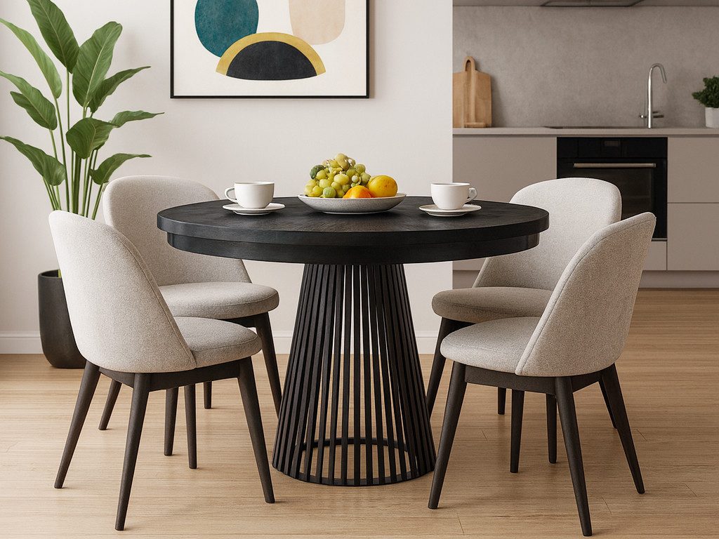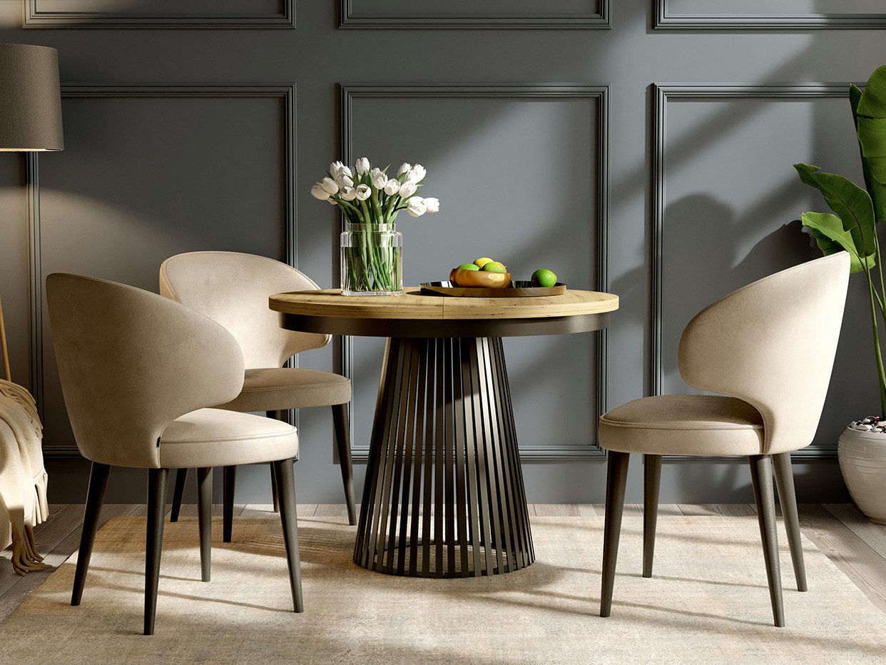 Dieser Esstisch vereint modernes Loft-Design mit Funktionalität und höchster Qualität. Die runde Tischplatte aus robuster, laminierter Spanplatte überzeugt nicht nur durch ihre elegante Optik, sondern auch durch ihre Pflegeleichtigkeit: Sie ist hitzebeständig und unempfindlich gegenüber Verfärbungen. Dank der zwei praktischen Einlegeplatten lässt sich der Tisch im Handumdrehen von 100 cm auf bis zu 180 cm verlängern – perfekt für gesellige Runden und Familienfeiern.