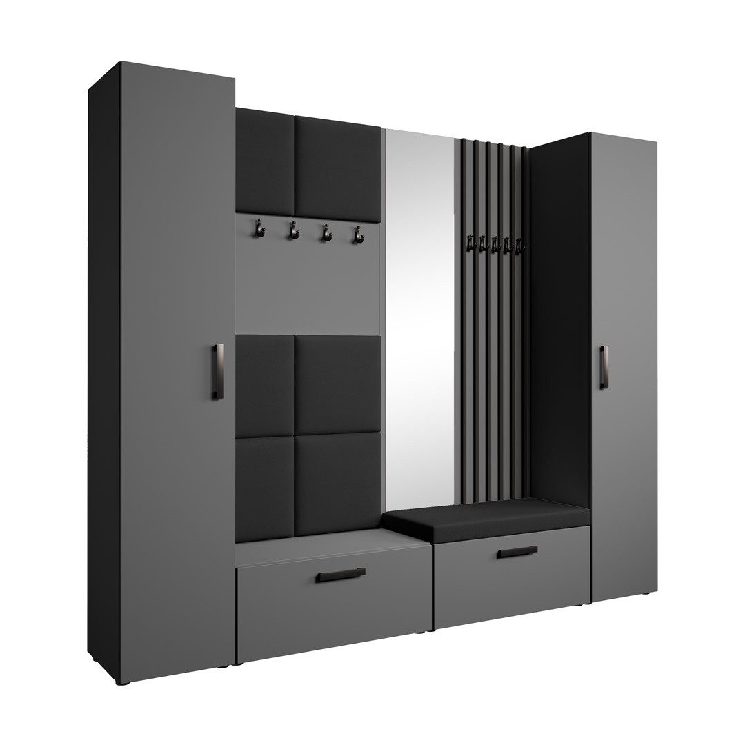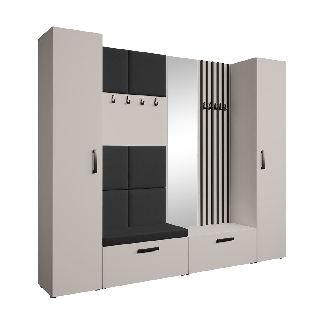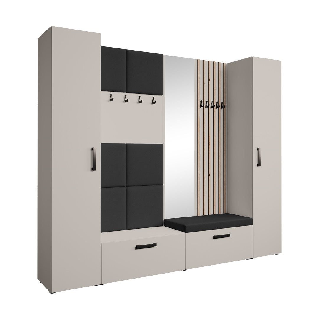 Geräumige Garderobe mit zwei Schränken, Spiegel, Lamellen und gepolsterten Paneelen ist die perfekte Lösung für große Flure. Mit einer Breite von 242 cm bietet sie reichlich Platz für Kleidung, Schuhe und Accessoires, während sie gleichzeitig einen modernen Look bewahrt.