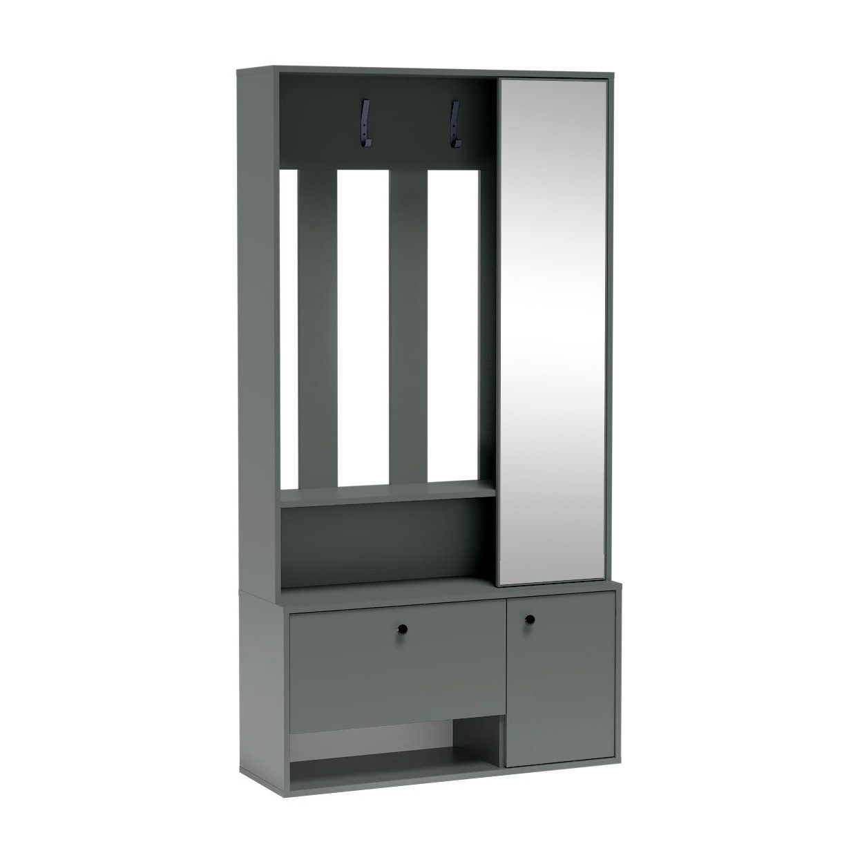 POTS UNI ist die perfekte Lösung für moderne, funktionale Eingangsbereiche. Mit ihrem integrierten Spiegel bringt sie Licht und Tiefe in den Flur, während offene Fächer und Haken für Ordnung sorgen. Besonders clever: Die universelle Konstruktion erlaubt die Montage wahlweise auf der linken oder rechten Seite, was maximale Flexibilität bei der Raumgestaltung ermöglicht.