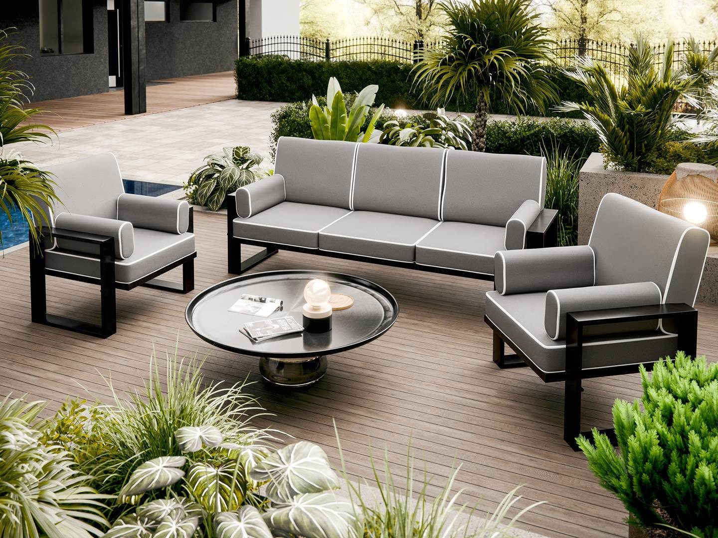 Das Set besteht aus einem großzügigen 3-Sitzer-Sofa und zwei Sesseln, die dank ihrer hochwertigen Verarbeitung und edlen Optik jedes Gartenambiente aufwerten. Der pulverbeschichtete Edelstahlrahmen sorgt für Langlebigkeit und Stabilität, während die Sitzflächen mit Wellfederung und die Polsterung aus T30-Schaumstoff außergewöhnlichen Sitzkomfort bieten. Die Rückenlehnen mit hochwertigen Silikonkugeln passen sich ergonomisch an und laden zum Entspannen ein.