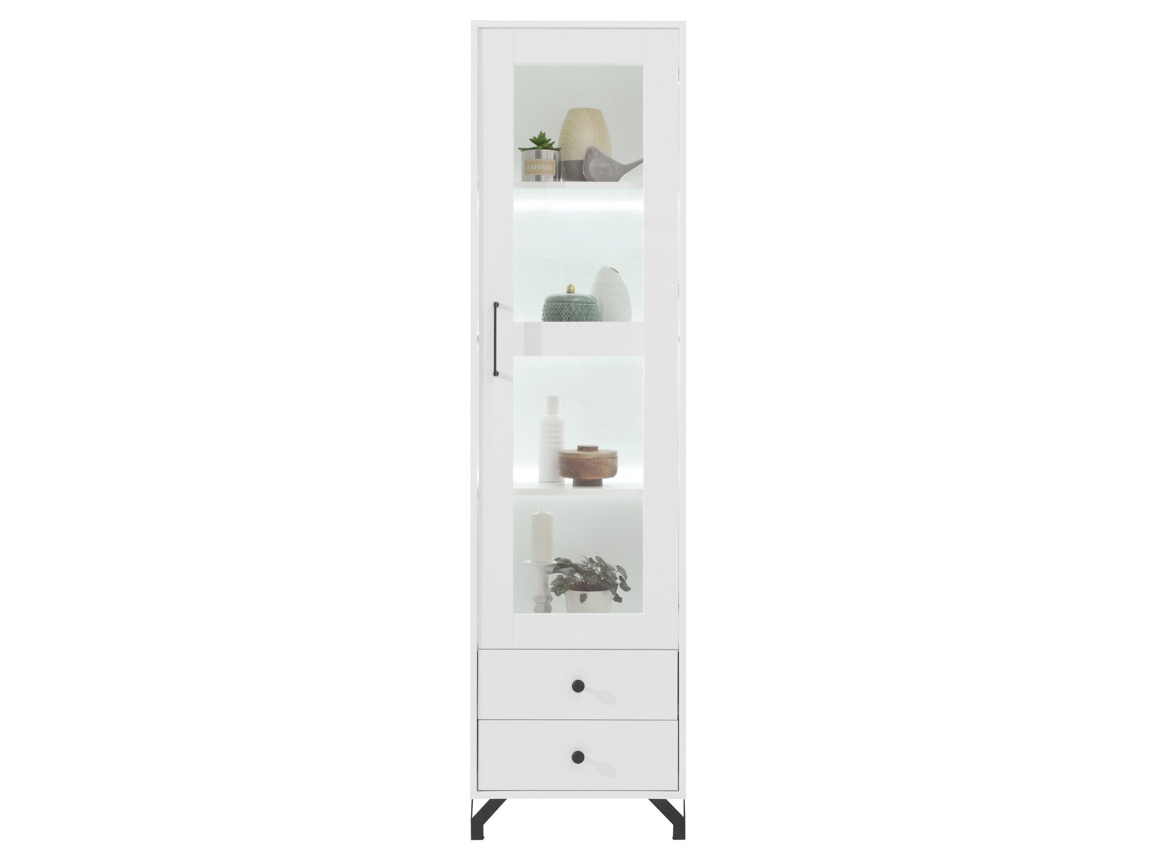 Das schmale Vitrinenregal BERGO bietet trotz kompakter Maße eine durchdachte Kombination aus Stauraum und stilvoller Präsentation. Hinter der Glastür befinden sich drei beleuchtete Böden, die Ihre Lieblingsstücke perfekt in Szene setzen. Die zwei unteren Schubladen sorgen für Ordnung und bieten Platz für alles, was nicht sichtbar sein soll.