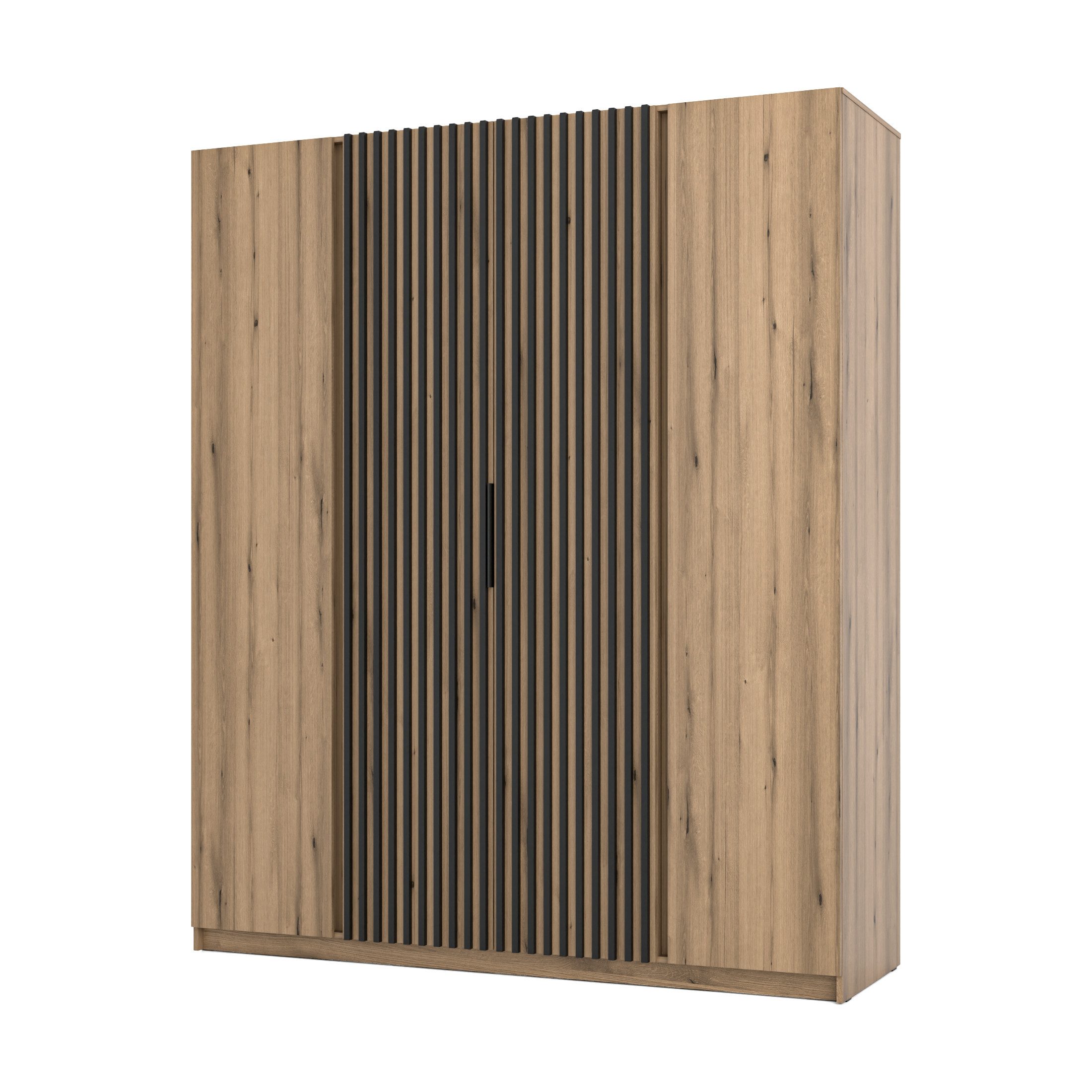 Entdecken Sie den einzigartigen Kleiderschrank mit Scharnier-Türen, der modernes Design mit Funktionalität vereint – perfekt für jedes moderne Schlafzimmer. Dieser viertürige Kleiderschrank mit einer beeindruckenden Breite von 200 cm wird nicht nur ein Aufbewahrungsort für Ihre Kleidung, sondern auch ein stilvolles Designelement in Ihrem Raum.