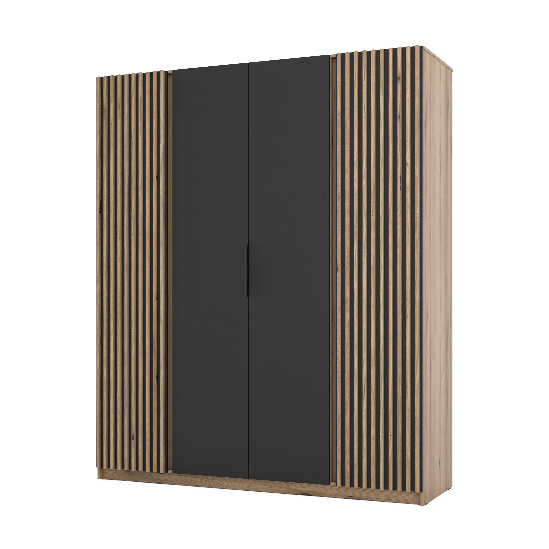 Besonders hervorzuheben sind die Lamellen, die zwei der Fronten des Schranks schmücken und ihm einen originellen Charakter sowie einen eleganten Look verleihen. Die Lamellen harmonieren perfekt mit der modernen Farbkombination – der Schrank ist in den Вариантыn Schwarz und Eiche Evoke erhältlich, wodurch er sich ideal in moderne, loftartige und industrielle Einrichtungen einfügt.