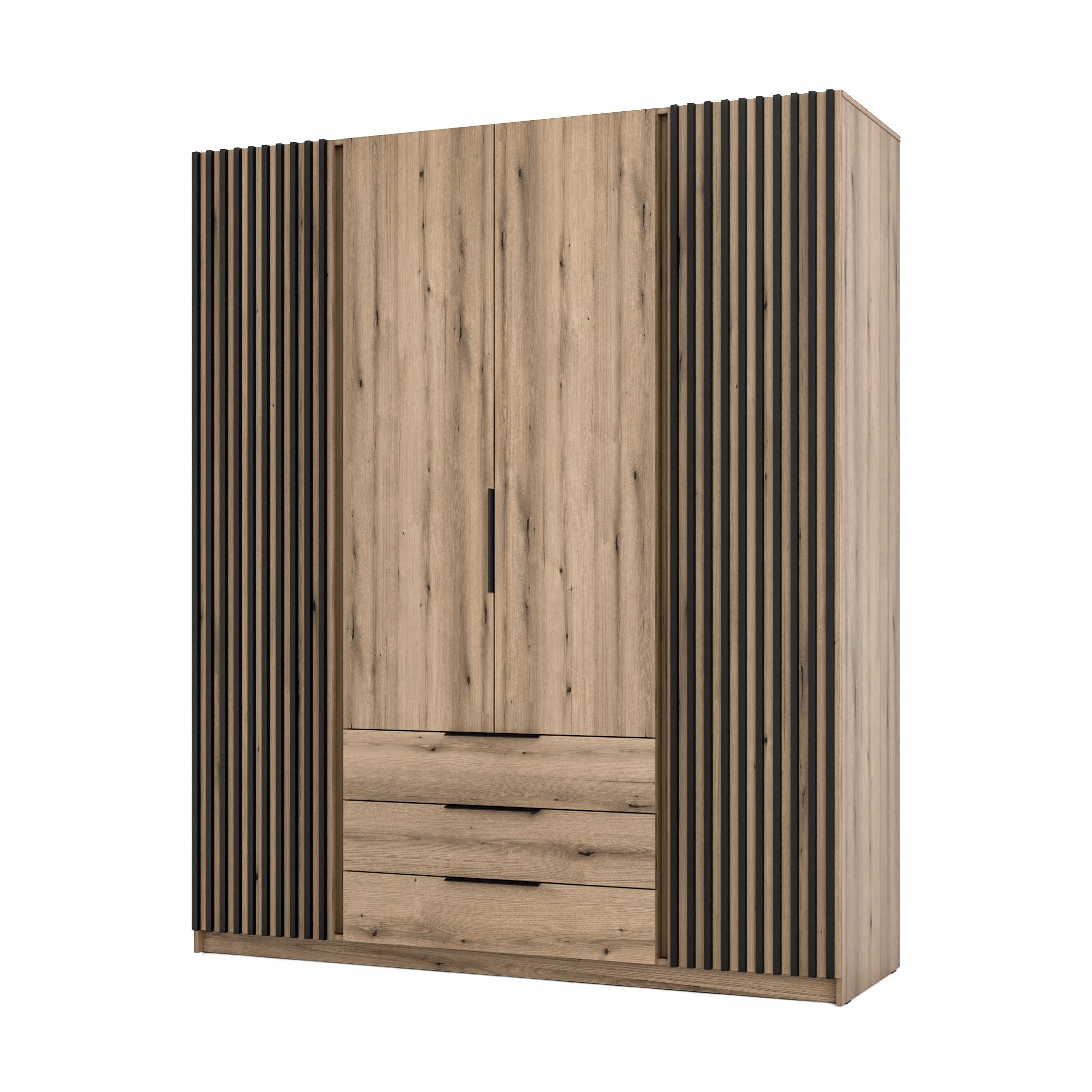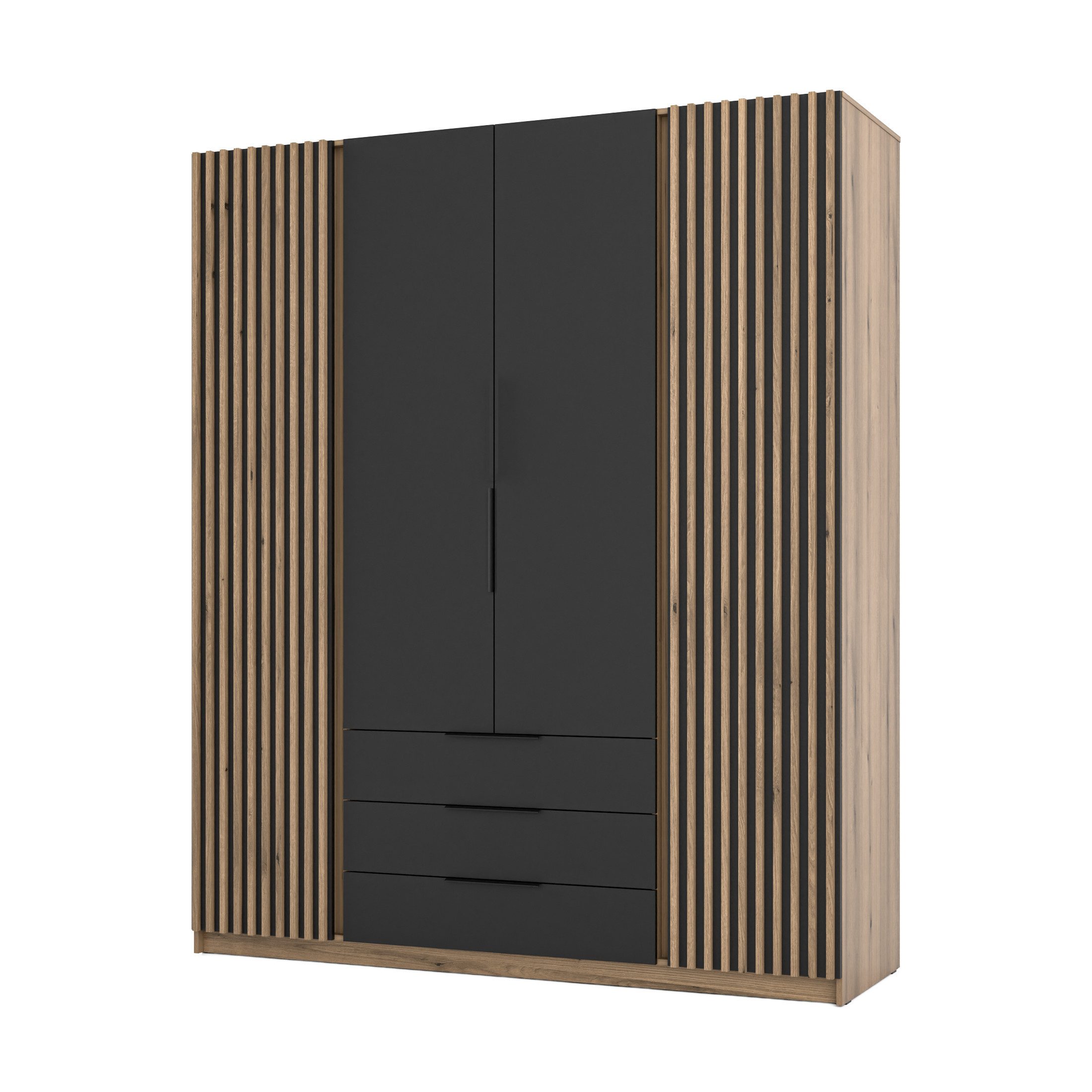 Die dekorativen Lamellen auf zwei der Türen setzen stilvolle Akzente und verleihen dem Schrank eine besondere Ästhetik, die sich in moderne Einrichtungsstile perfekt einfügt. Die Kombination aus schwarzem Korpus und Eiche Evoke sorgt für einen warmen, kontrastreichen Look, der sowohl in minimalistischen als auch in industrialen Interieurs besticht.