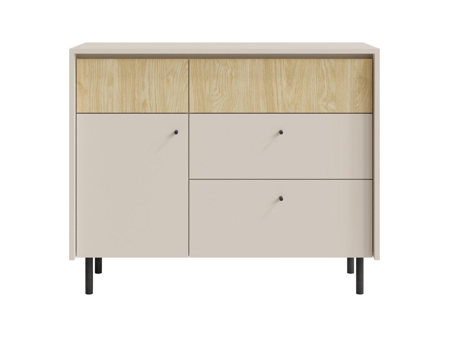 Dank der harmonischen Farbkombination, stabilen Metallfüße und ABS-Kanten ist die Kommode nicht nur stilvoll, sondern auch langlebig und robust. Die MONAKO Kommode vereint praktischen Stauraum und modernes, minimalistisches Design auf kompakter Fläche und wird so zum funktionalen Highlight in jedem Raum.