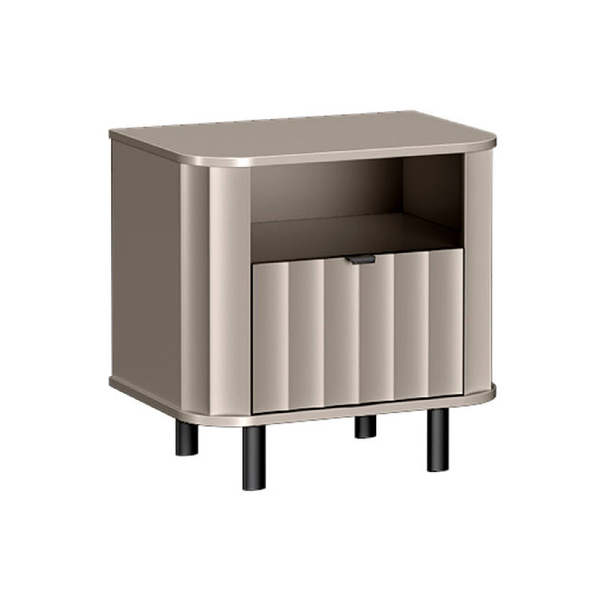 Die matt folierten MDF-Fronten mit feiner vertikaler Fräsung verleihen dem Nachttisch ein modernes und zugleich dezentes Erscheinungsbild. Erhältlich in den zeitlosen Farben Alpine White und Clay Gray, passt er optimal zu anderen Möbelstücken der NEVADA-Serie.