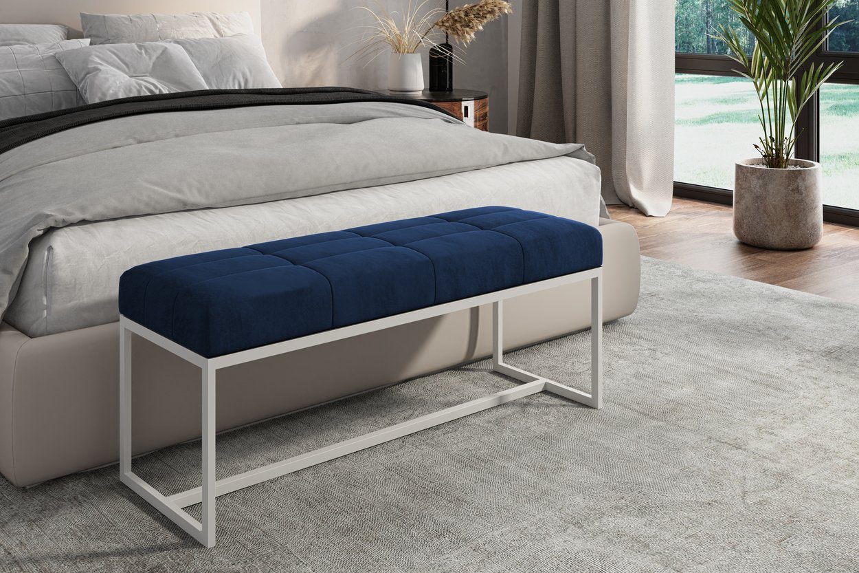 Das Metallgestell bietet eine solide Unterstützung und Haltbarkeit und verleiht der Bank ein modernes Aussehen. Das Metallgestell ist in Weiß, Schwarz, Chrom und Gold erhältlich, was Eleganz und Luxus verleiht.