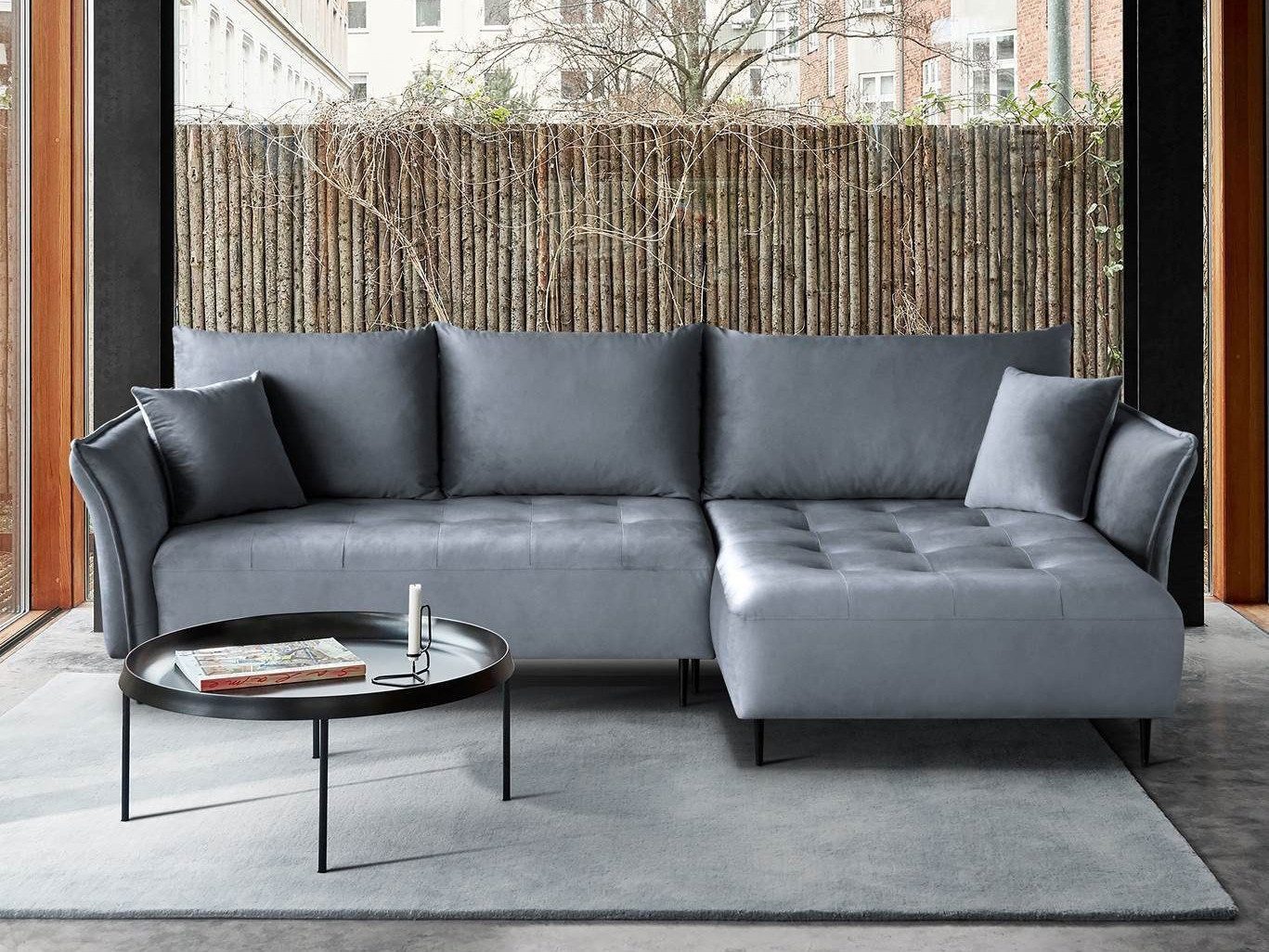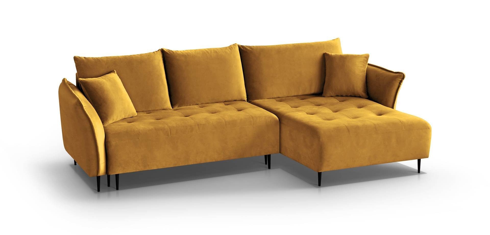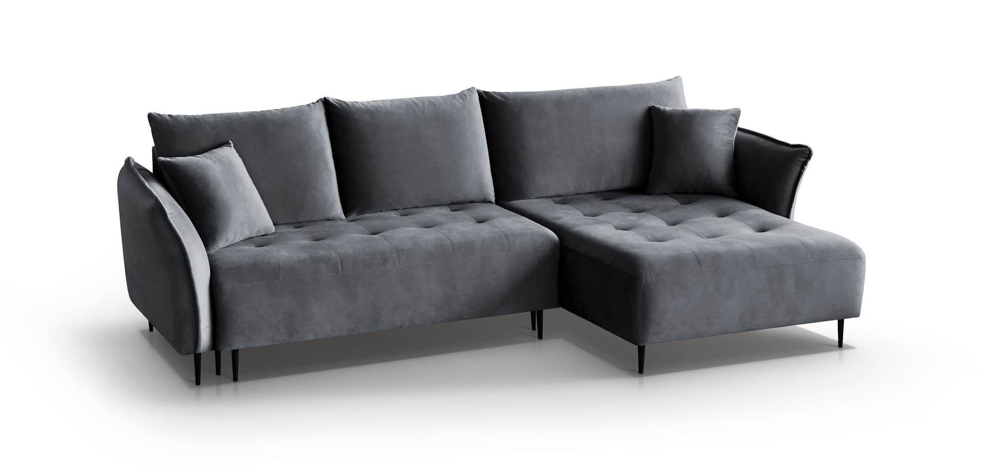 Suchen Sie eine praktische und komfortable und gleichzeitig optisch ansprechende Ecke für Ihr Zuhause? Schauen Sie sich das Modell Bali an! Dank ihm werden Momente der Ruhe nach einem langen Arbeitstag viel angenehmer! Das gepolsterte Ecksofa Bali ist ein Wohnzimmermöbel, das nach modernen Trends entworfen wurde. Es bietet bis zu 3 große Rückenkissen, dank denen wir zusätzliche seitliche Rückenlehne auf der Ottomane gewinnen. Eine ausziehbare Liege ist eine großartige Möglichkeit, um sich vor dem Fernseher zu entspannen oder an Ihrem Laptop in einer halb liegenden Position zu arbeiten. Die moderne Ecke bietet eine Schlaffunktion mit einer Fläche von 240x128 cm und einen funktionalen Bettkasten für Textilien oder Bettwäsche, der es einfach macht, Ordnung in Ihrem Zuhause zu halten. Hohe, schwarze Metallbeine weisen auf seinen modernistischen Stil hin.