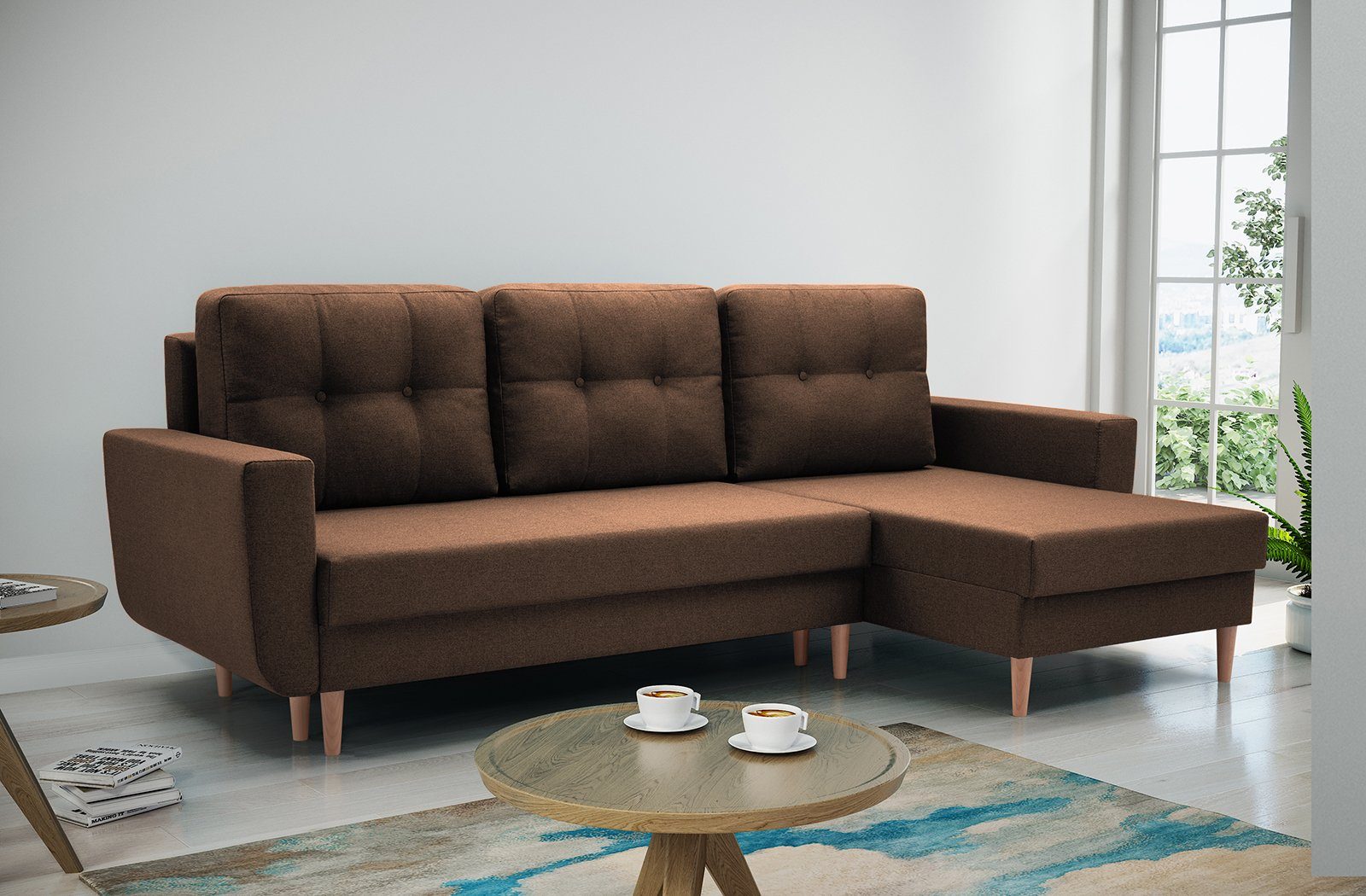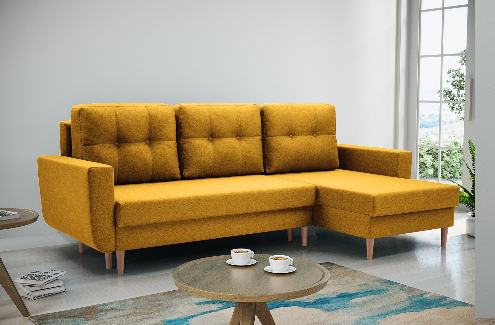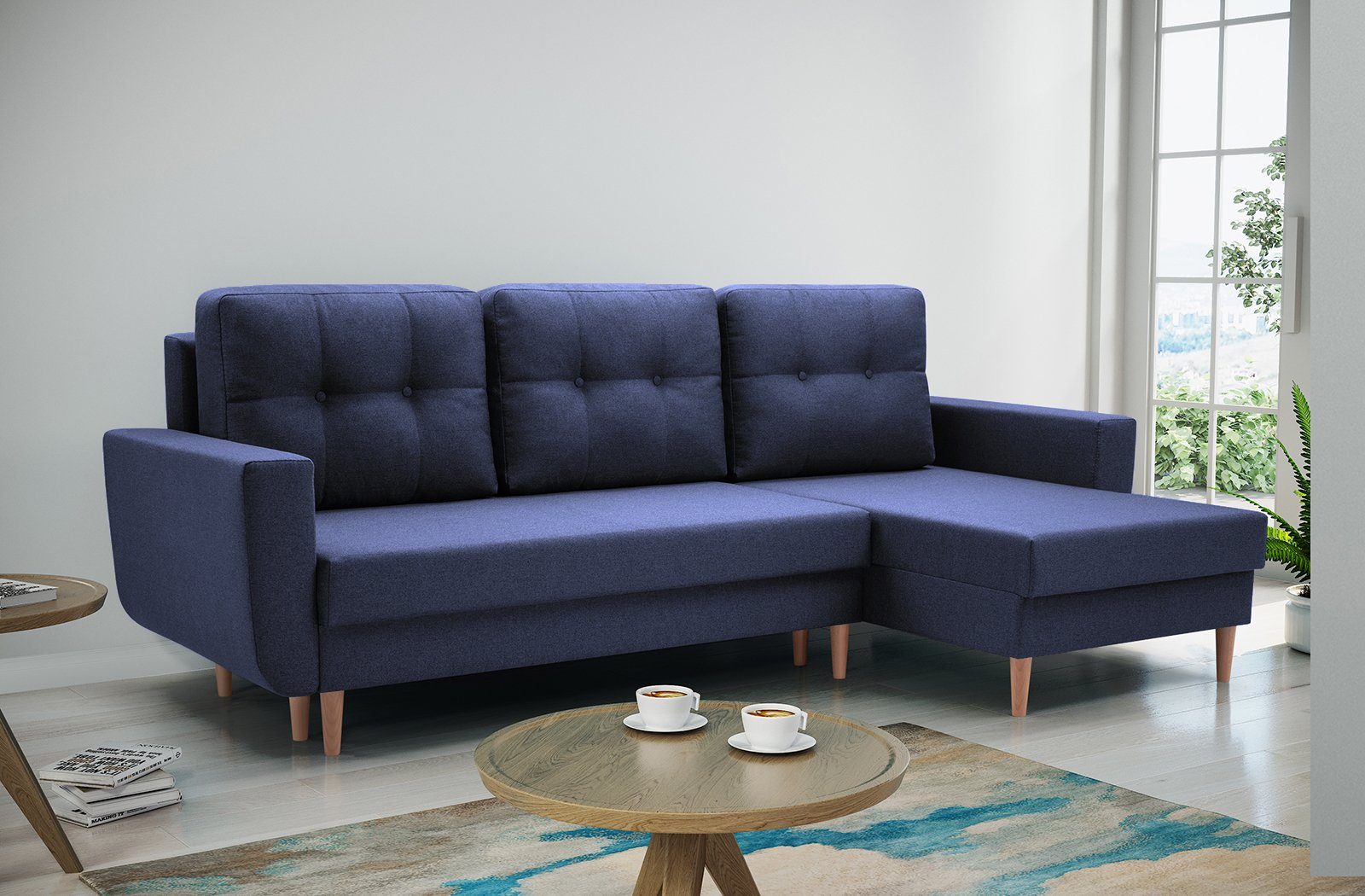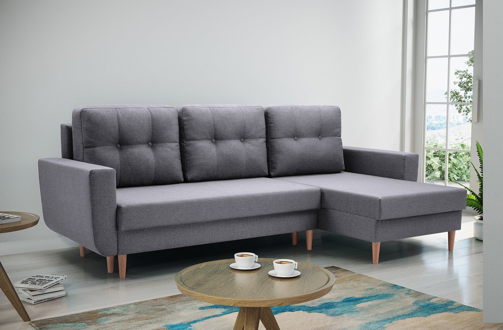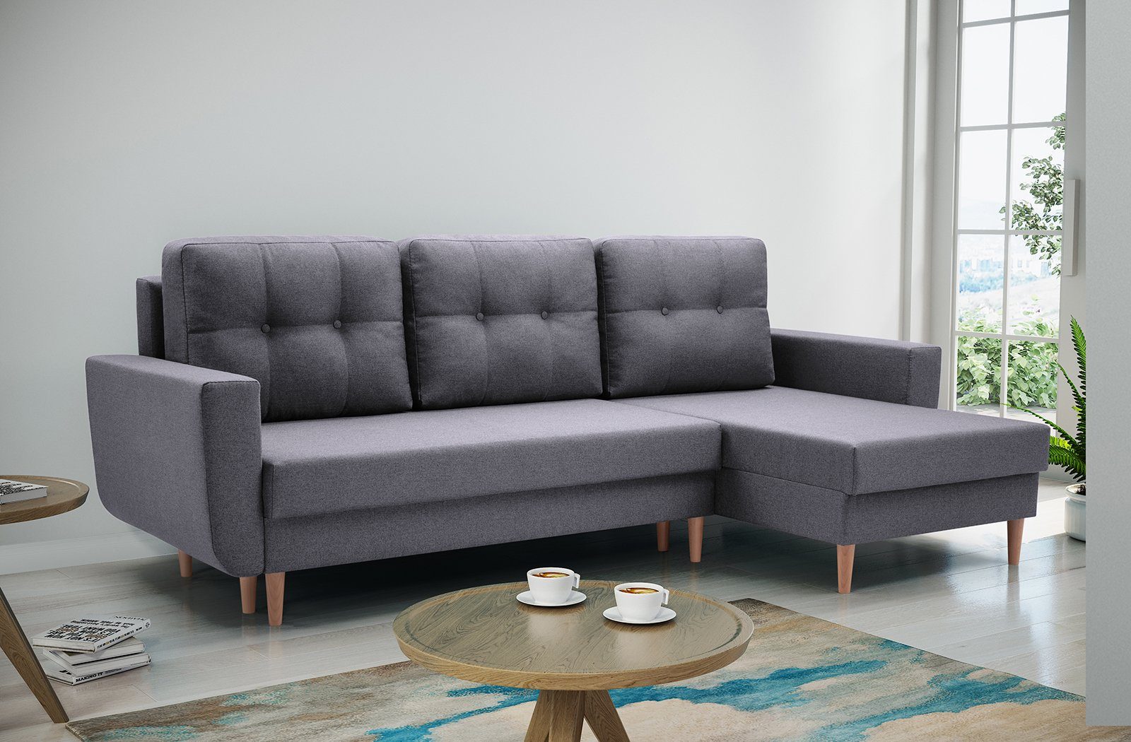 Eleganten Ecksofa mit komfortable Polsterung. Das Eckosoha hat universelle Ottomane. Ein Sofa mit hohen Beinen im skandinavischen Stil. Die abnehmbaren Rückenkissen weisen eine dezente Steppung auf, die typisch für skandinavische Polstermöbel ist. Das Ecksofa mit universelle Ottomane mit charakteristischen Säumen wird Ihrem Wohnzimmer sicherlich Charakter verleihen. Möbelfarben zur Auswahl: Hellblau, Anthrazit, Braun, Marineblau, Gelb, Grau, Dunkelgrau. Stoff: Malmo New, Struktur-Gewebe.