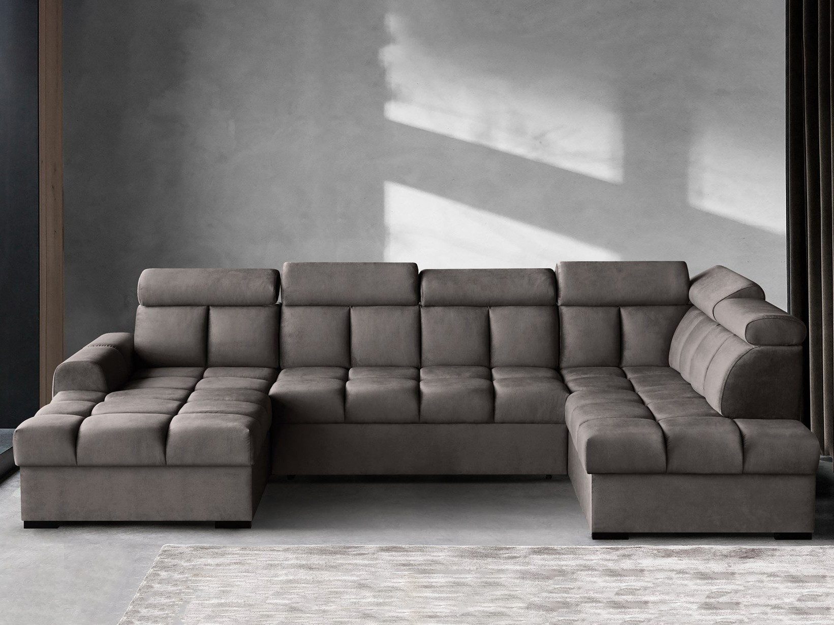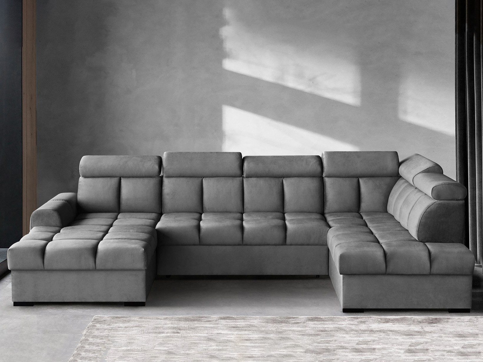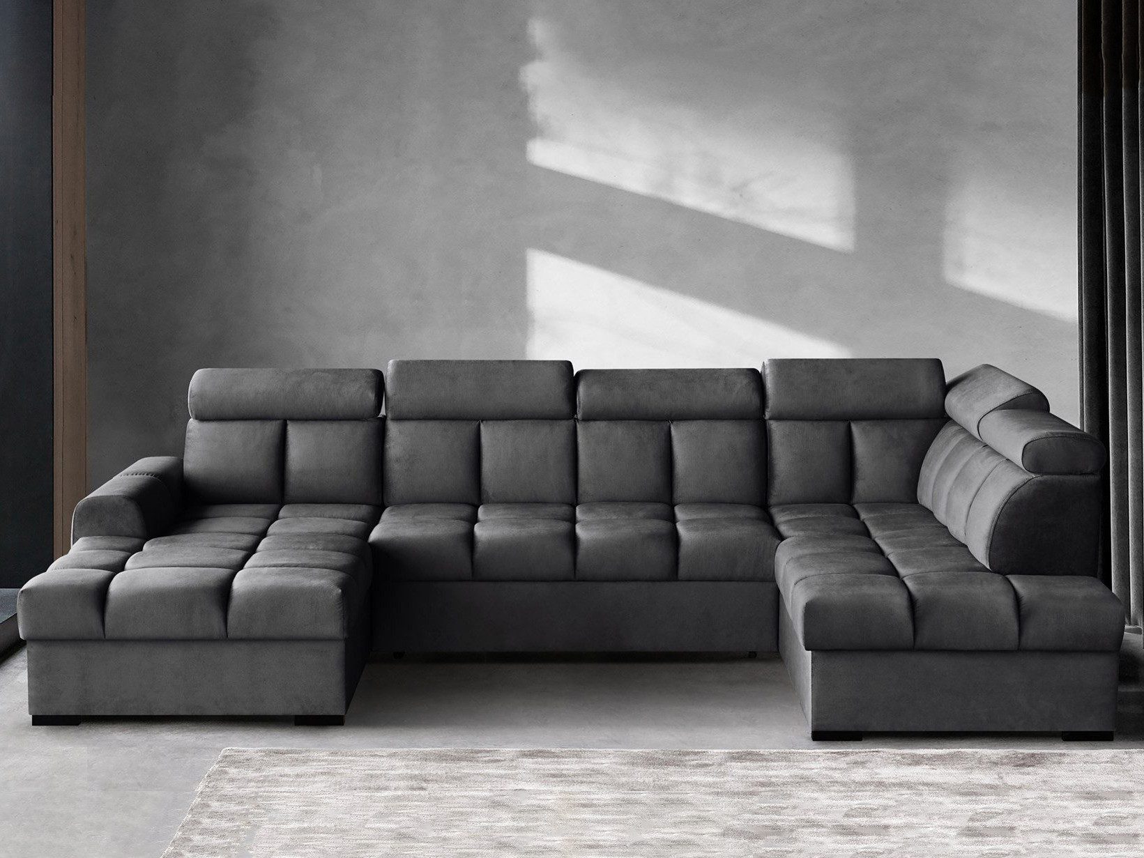 Träumen Sie von einem sehr bequemen Ecksofa für das Wohnzimmer? Schauen Sie sich das große Ecksofa Gomez U in modernem Design an! Die bequeme Sitzfläche des XXL Ecksofa Gomez U wird Ihnen dank der Wellfederung eine tolle Erholung bescheren und Sie können es bei Bedarf in ein bequemes Bett mit einer großen Schlaffläche von 130 x 270 cm verwandeln, geöffnet mit die Hilfe eines Delfinmechanismus. Es verfügt über zwei große Bettkasten, in denen Sie alle notwendigen Dinge bequem verstauen können. Mit dem großen XXL Ecksofa Gomez U schonen Sie Ihre Gesundheit dank verstellbaren Kopfstützen, die sich an die Anforderungen Ihres Rückens anpassen lassen. Erhältlich in 5 Farben aus Bluvel-Veloursstoff.