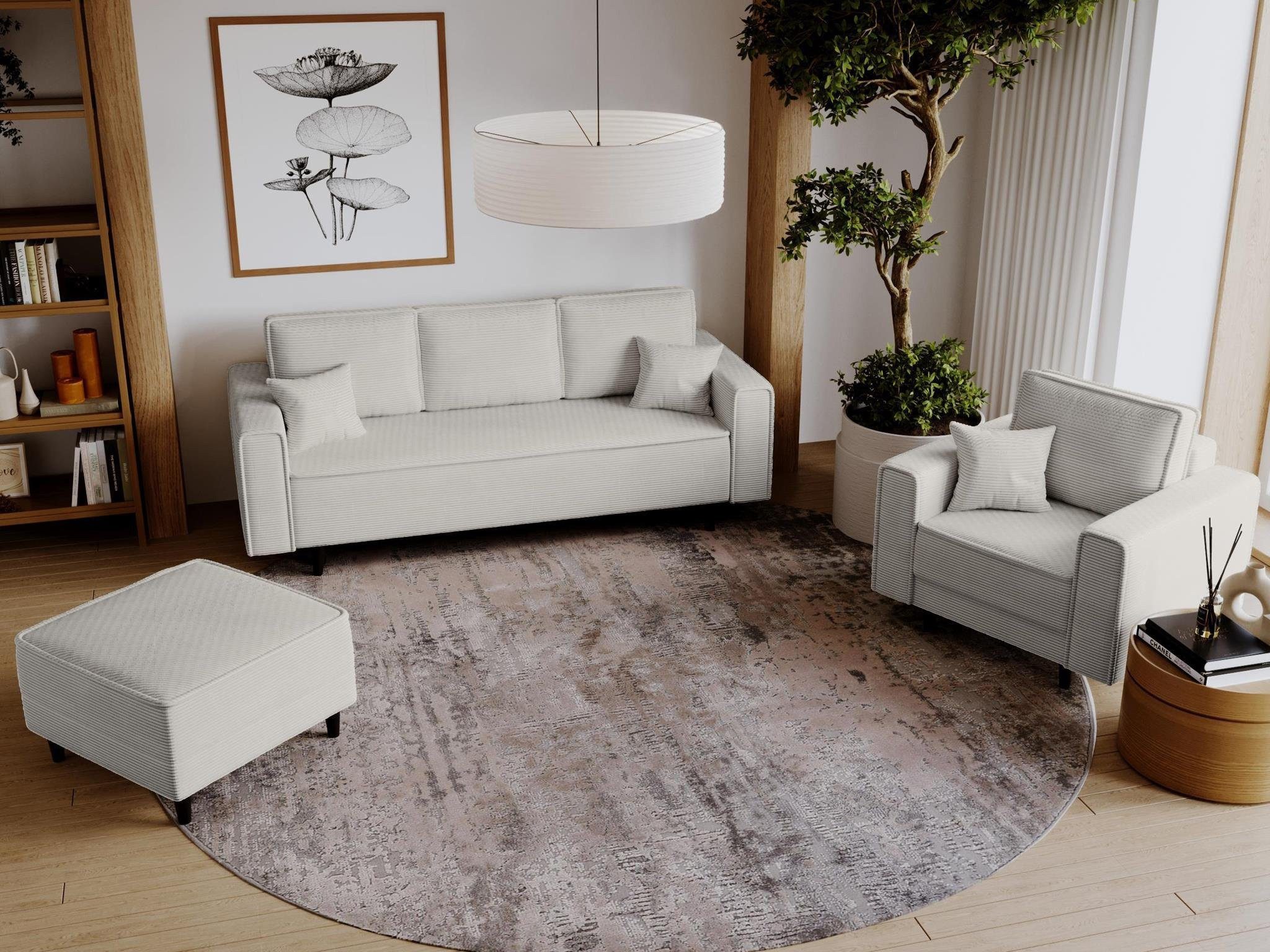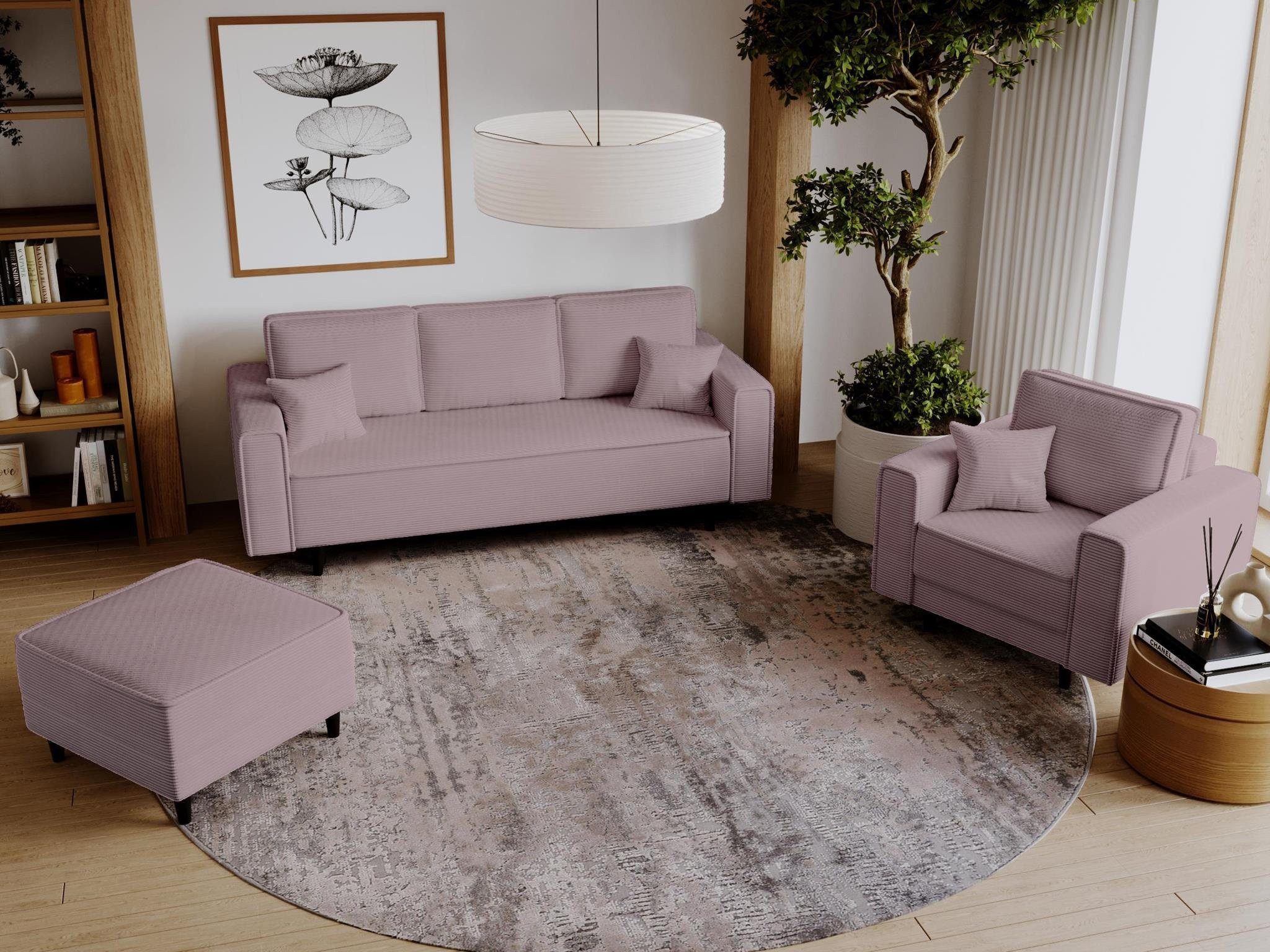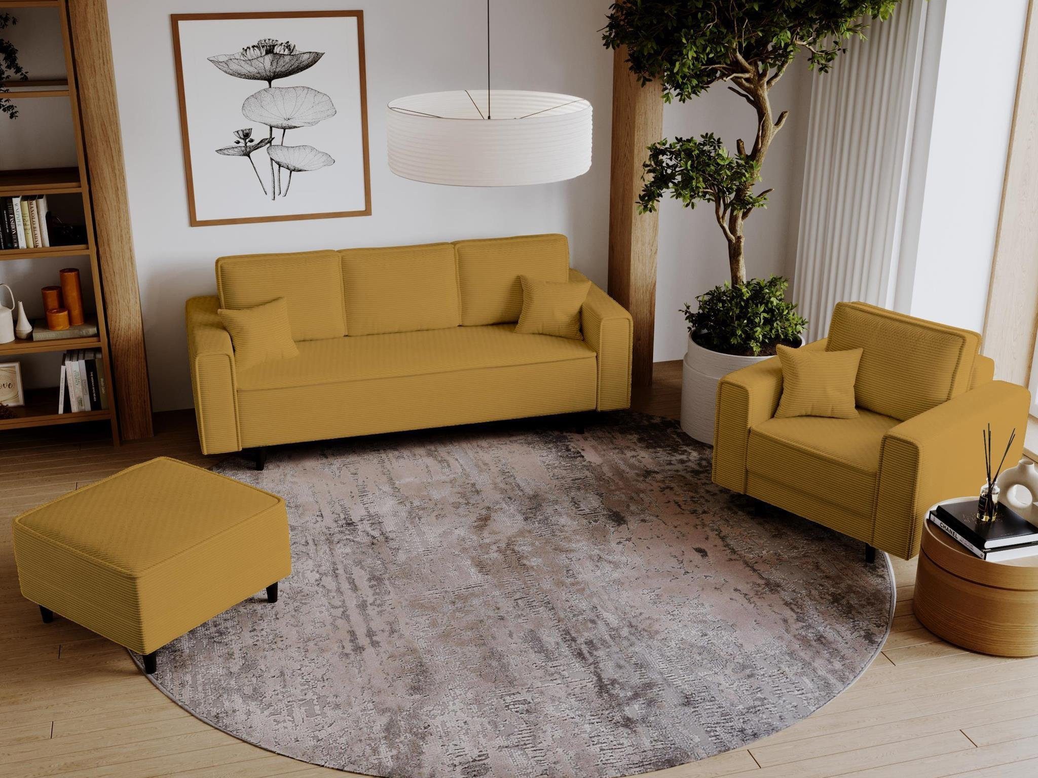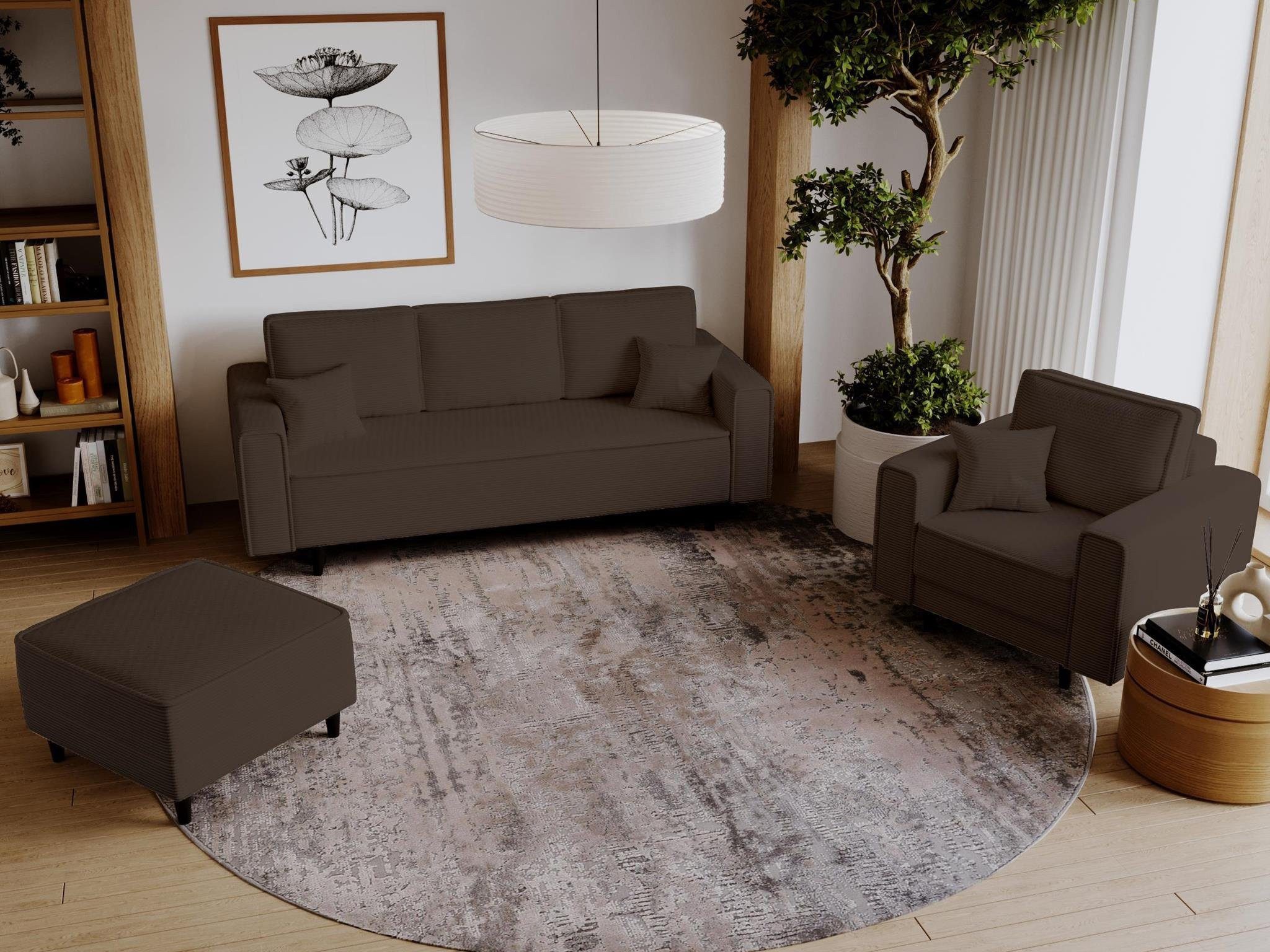 Tauchen Sie ein in Luxus und Komfort mit unseren Polstermöbeln aus Cordstoff Monte. Unser Schlafsofa ist nicht nur ein eleganter Sitzplatz, sondern auch ein praktischer Ort, um sich nach einem anstrengenden Tag auszuruhen. Schwarze Holzbeine fügen einen modernen Akzent hinzu und unterstreichen den einzigartigen Charakter des Polstersets. Monte Die Möbelsitze sind mit Wellenfedern ausgestattet, die unvergleichlichen Komfort und Unterstützung beim Entspannen bieten. Cordstoff verleiht den Möbeln ein zartes und gemütliches Aussehen und fügt gleichzeitig Ihrem Interieur einen Hauch von Luxus hinzu. Komplett mit einem Sofa gibt es einen eleganten Sessel, der die Einrichtung des Wohnzimmers perfekt ergänzt. Darüber hinaus fungiert der Hocker aus der gleichen Serie sowohl als praktisches Accessoire als auch als dekoratives Designelement. Entdecken Sie eine neue Dimension der Entspannung und des Stils mit unserem Dunkelgrau Polsterset Monte