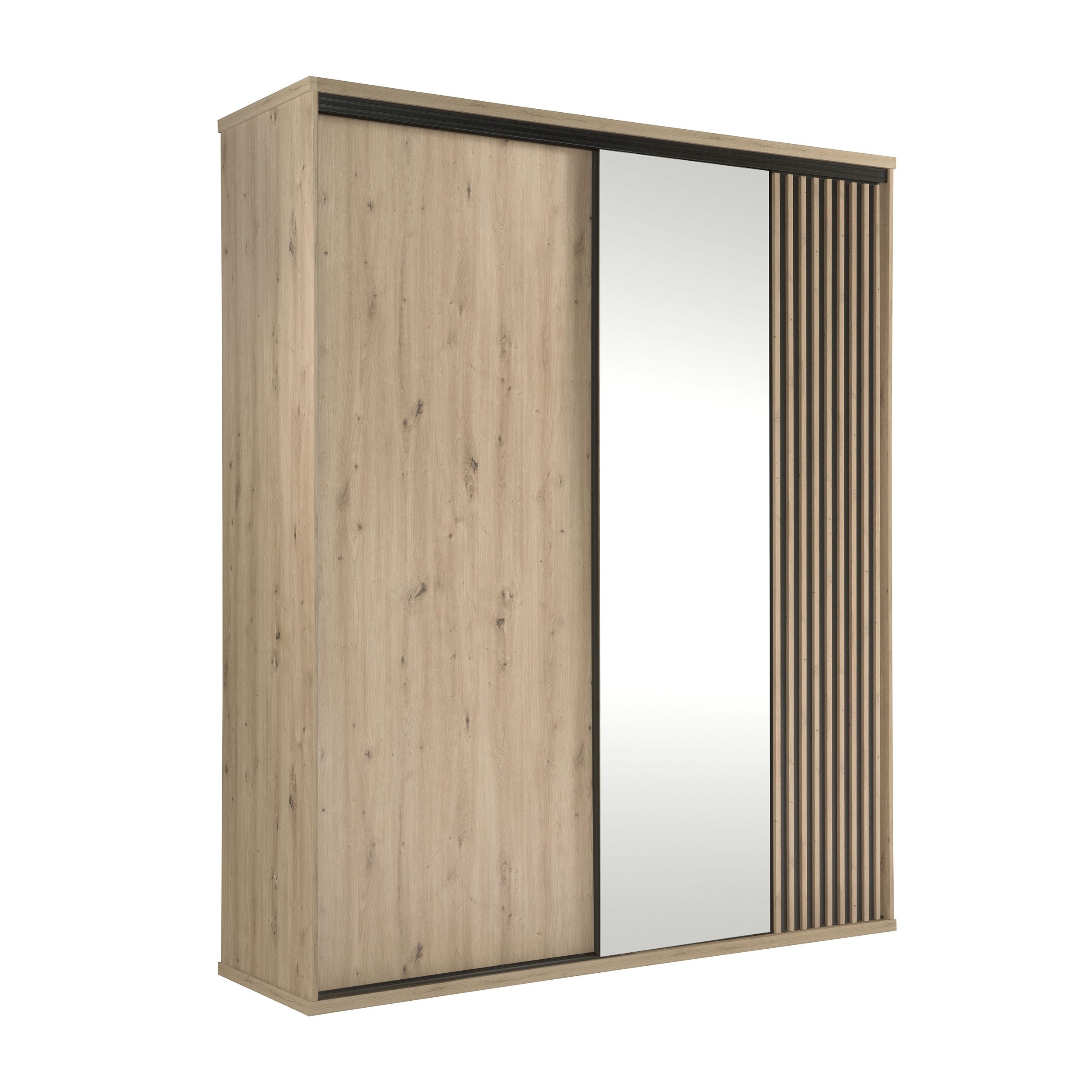 Die Konstruktion basiert auf hochwertigen Laminatplatten mit ABS-Kanten, ergänzt durch eine stabile HDF-Rückwand. Im Inneren findest du eine Kleiderstange und mindestens fünf Regalböden – ideal für eine übersichtliche Organisation. Dieses Design bietet ein perfektes Gleichgewicht zwischen stilvoller Optik und Alltagstauglichkeit.