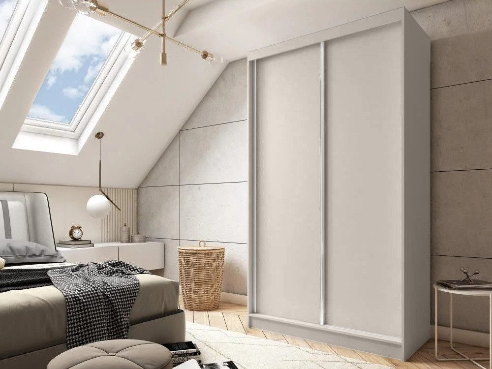 Der Kleiderschrank bietet außerdem verschiedene Breitenoptionen: 120, 150, 160, 180, 200, 240 cm, wodurch er an unterschiedliche Bedürfnisse und Räume angepasst werden kann. Der Verzicht auf Griffe unterstreicht den minimalistischen Charakter des Möbels zusätzlich, und die Verwendung eines Touch-Öffnungssystems oder versteckter Schlitze in den Türen sorgt für eine komfortable Nutzung, ohne die reine Form des Kleiderschranks zu stören.