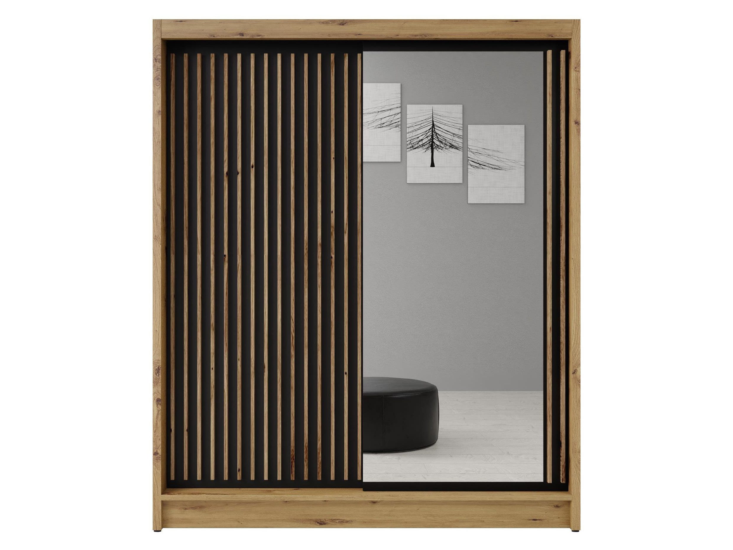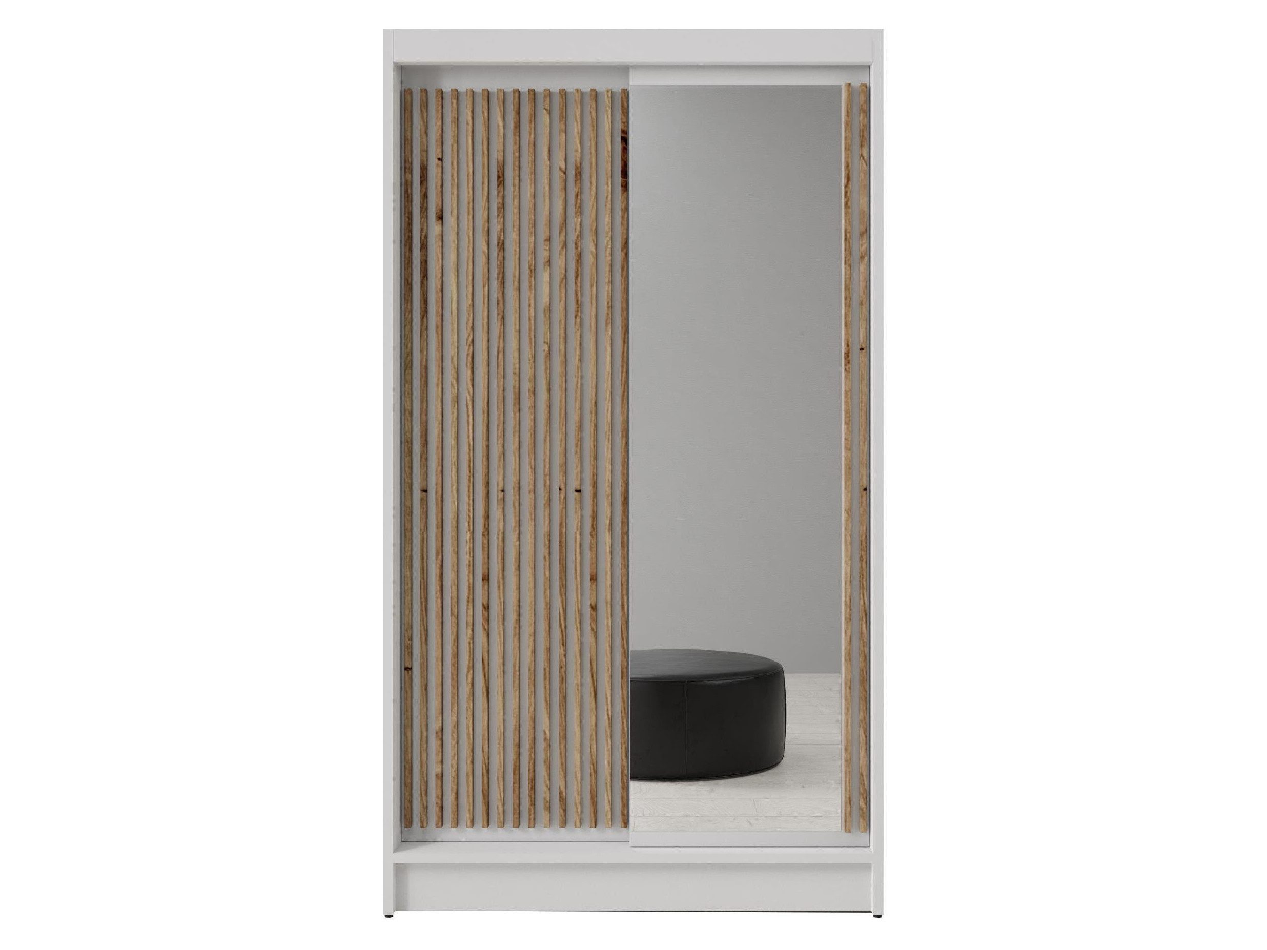 Eine der Türen dieses Schranks ist mit eleganten Holzlamellen versehen, die der gesamten Komposition einen einzigartigen Charakter und eine Leichtigkeit verleihen. Dies ist nicht nur eine praktische Lösung, sondern auch ein ästhetischer Akzent, der diese Garderobe von anderen abhebt.