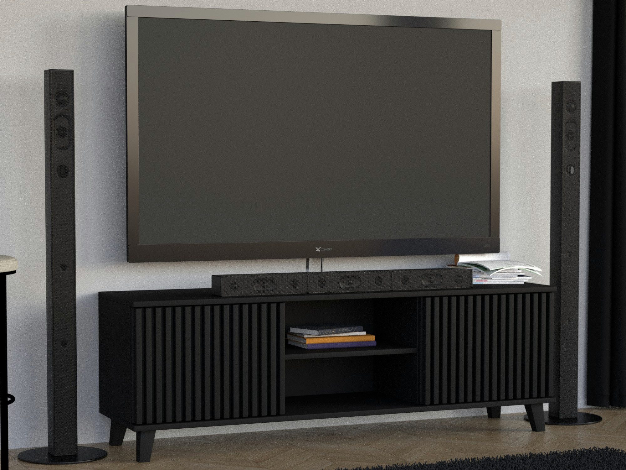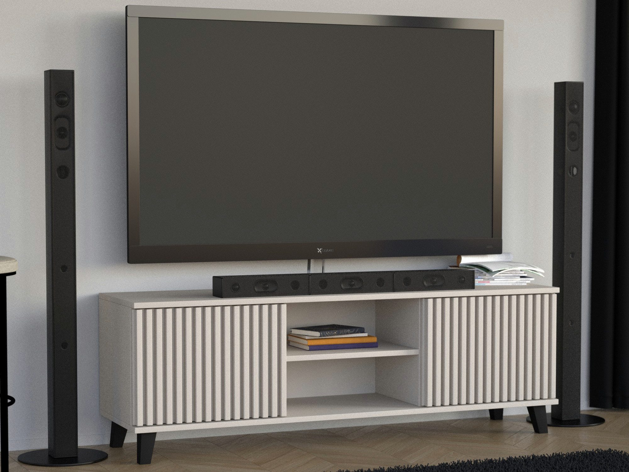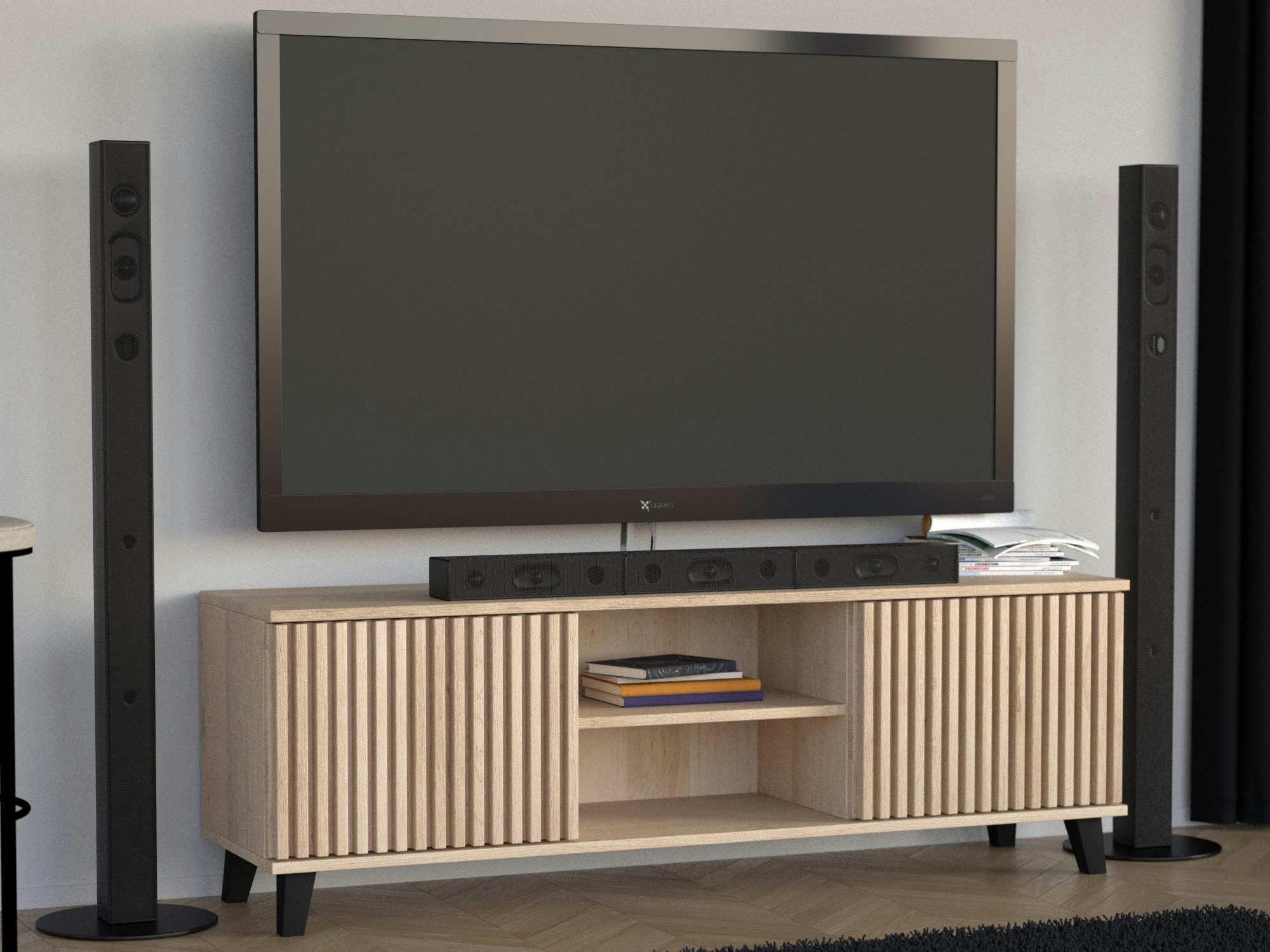 Die TV-Schrank HOME RTV vereint zeitgemäßes Design mit hoher Funktionalität. Seitliche Schränke bieten Platz für Kabel, Spiele oder Zubehör, während das offene Regalfach in der Mitte perfekt für Receiver, Konsolen oder Player geeignet ist. Die dekorativen Lamellen auf den Fronten verleihen dem Möbelstück eine elegante, moderne Optik und setzen stilvolle Akzente im Raum. Durch die klaren Linien und die Auswahl an Farben und Ausführungen passt der Schrank ideal zu verschiedenen Einrichtungsstilen.