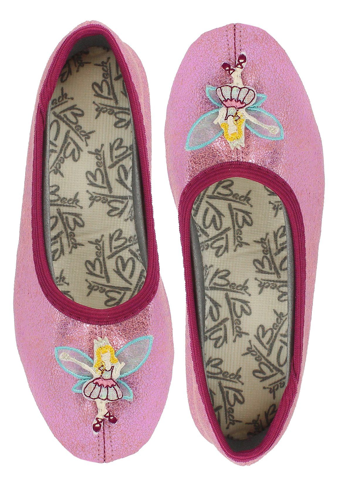 Dieses Schläppchen lässt die Herzen aller Mädchen höher schlagen! Besonders elegantes glitzerndes Obermaterial in Pink mit fantasievoller Fee. Die rutschfeste Laufsohle macht den Schuh zu einem Allroundtalent: egal ob für Gymnastik, Sport oder Zuhause. Gewohnt hochwertige Beck-Qualität. Handmade in Erlenbach.