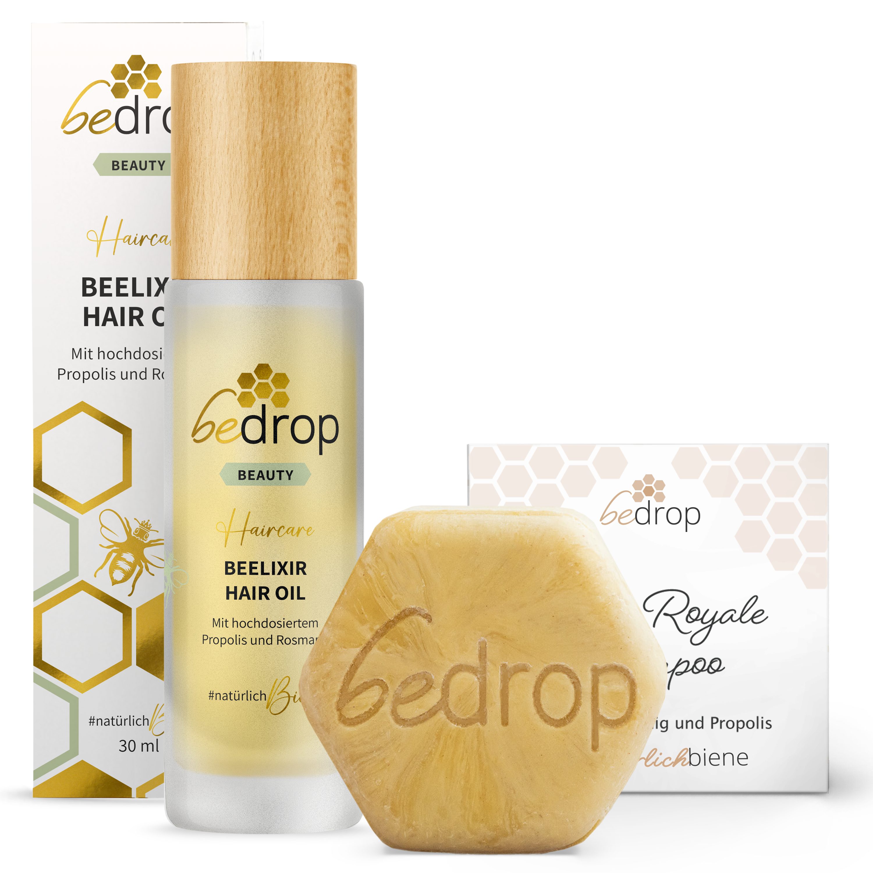 Anwendung | BEELIXIR HAIR OIL: Vor dem Styling: Verteile 2 Pumpstöße im nassen oder handtuchtrockenen Haar. Stelle vor dem Styling sicher, dass das Öl vollständig vom Haar aufgenommen wurde. Nach dem Styling: Verwende 1-2 Pumpstöße als Finish, indem du das Öl in die trockenen Haarspitzen einarbeitest. Gelée Royale festes Shampoo: Das feste Gelée Royale Shampoo in der feuchten Hand oder im nassen Haar umkreisen und aufschäumen lassen. Gut einmassieren und gründlich ausspülen. |