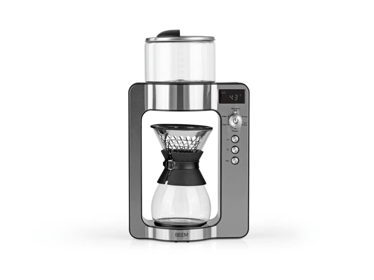 Die Kaffeemaschine mit rotierendem Brühkopf ist für den klassischen kreisförmigen Aufguss von Pour Over Kaffee bekannt. Der Kaffee wird durch einen Kaffeefilter direkt in die hitzebeständige Borosilikat Glaskaraffe mit abnehmbarer Silikonmanschette gelassen. Mit Hilfe der Manschette können sie die Kaffeekanne aus Glas auch in heißem Zustand anfassen und servieren.