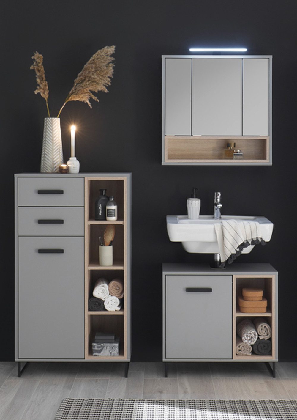 Set beinhaltet | bestehend aus: Spiegelschrank B/H/T 65x65x16 cm, Waschbeckenunterschrank B/H/T 65x61x38 cm, Highboard B/H/T 65x116x38 cm |