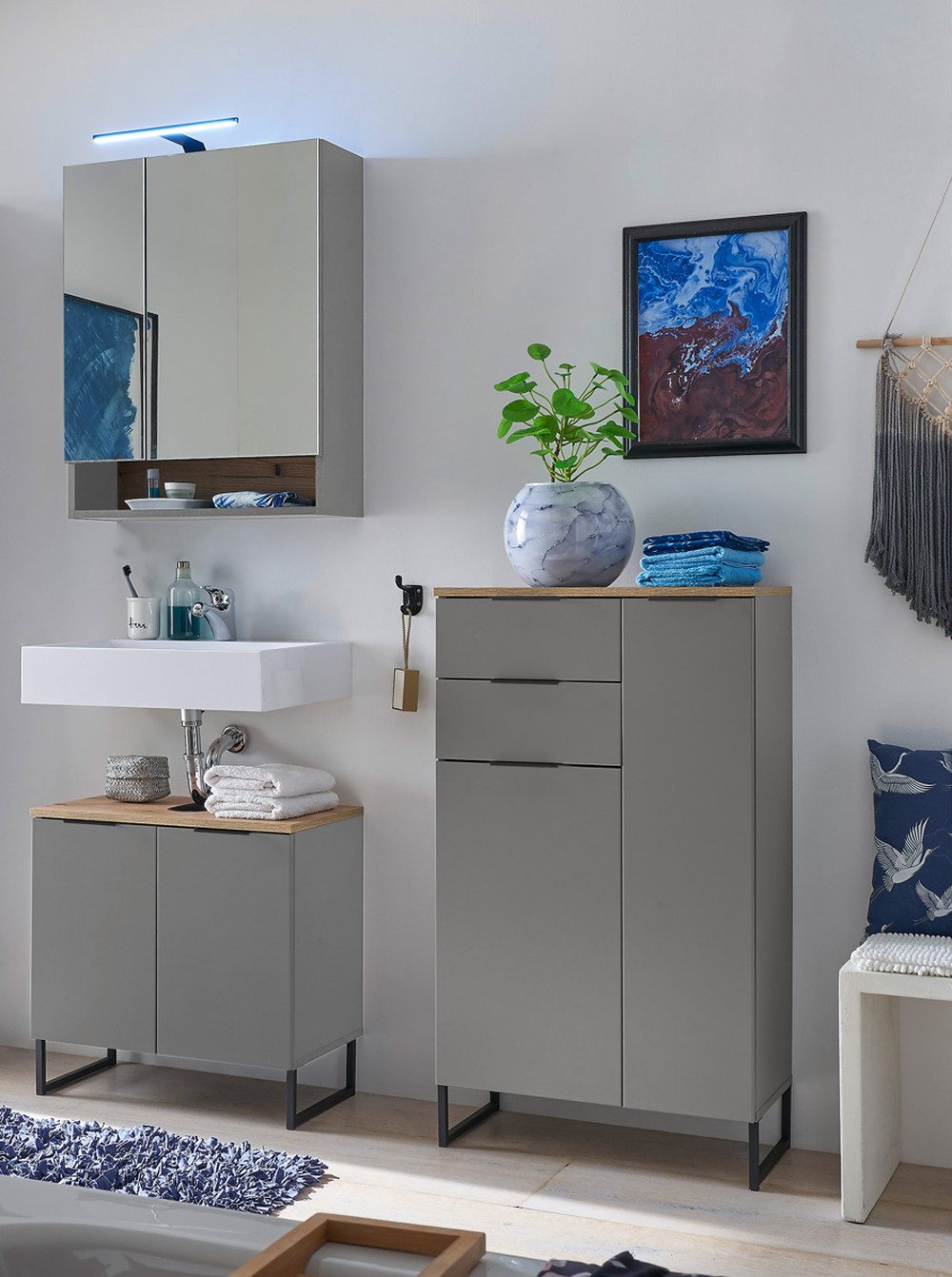 Set beinhaltet | Waschbeckenunterschrank B/H/T 60x60x35 cm, Spiegelschrank inkl. LED B/H/T 60x75x22 cm, Highboard B/H/T 60x106x32 cm |