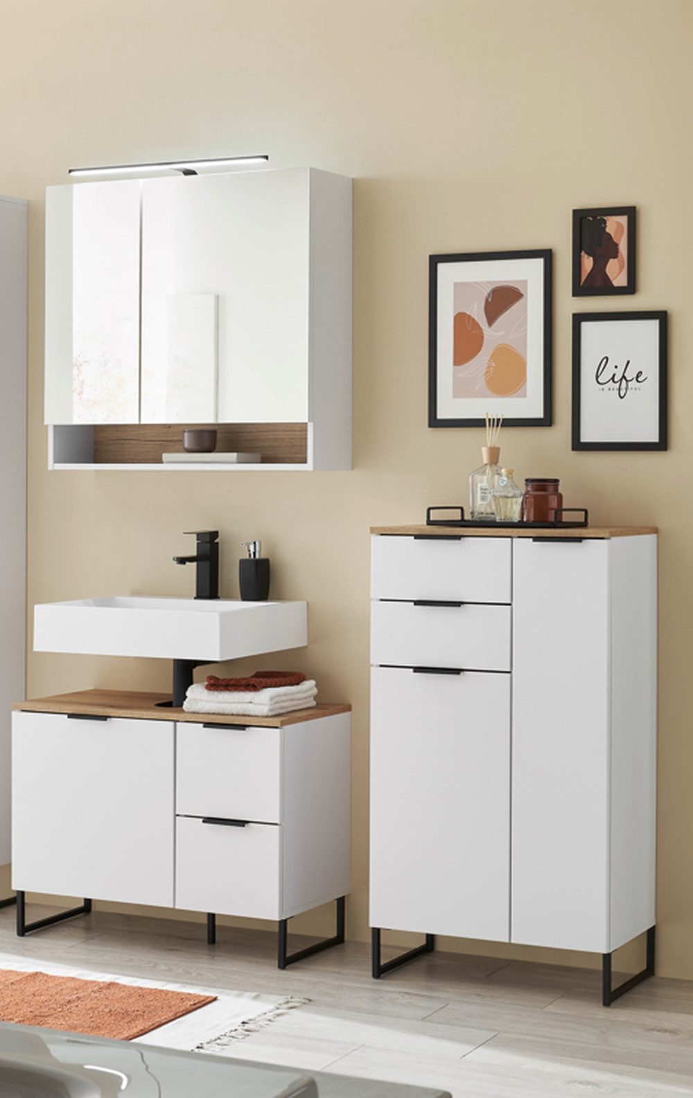 Set beinhaltet | Waschbeckenunterschrank B/H/T 80x60x35 cm, Spiegelschrank inkl. LED B/H/T 80x75x22 cm, Highboard B/H/T 60x106x32 cm |