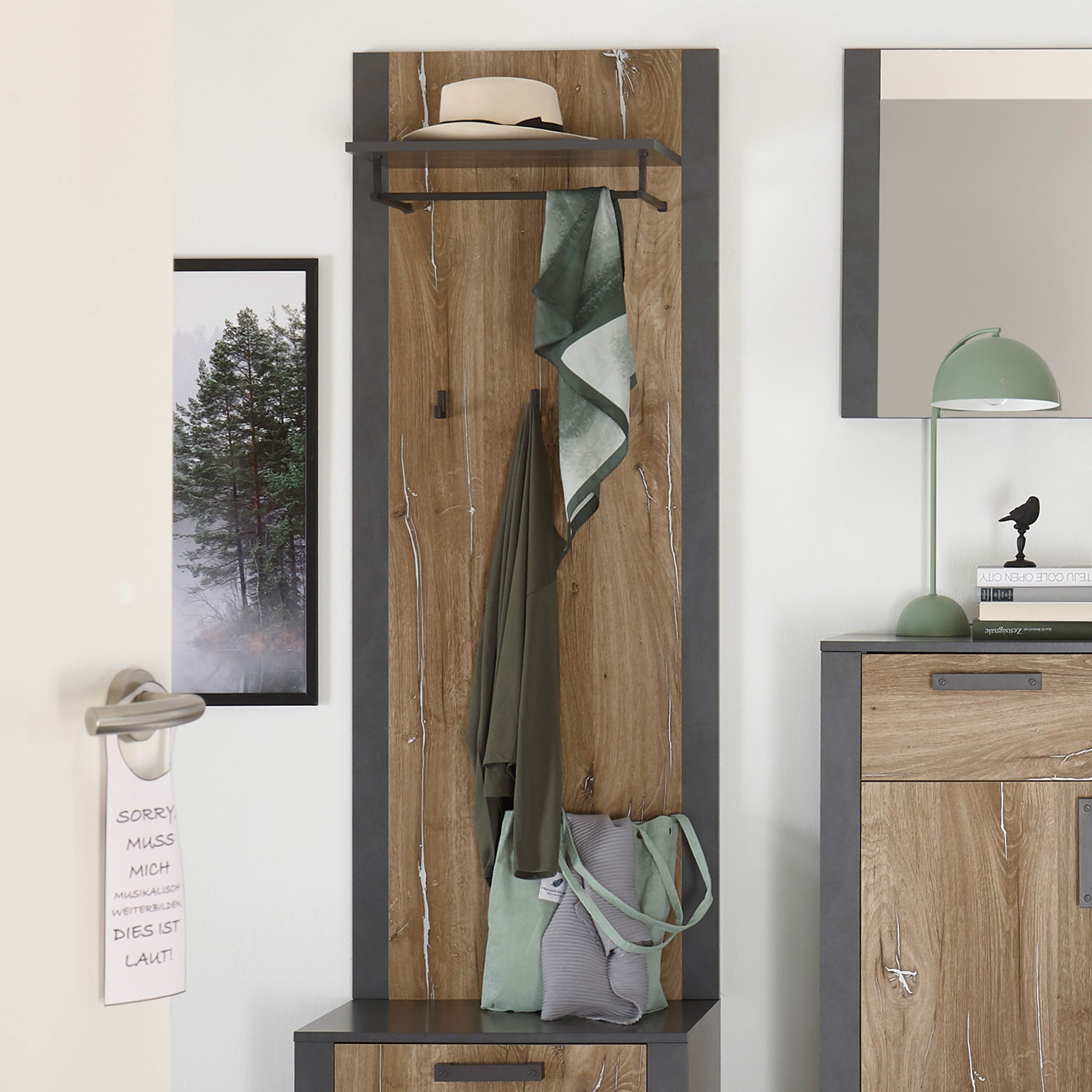 Das Paneel bietet mit einer Hutablage, einer Kleiderstange sowie drei praktischen Kleiderhaken reichlich Platz für Jacken, Mäntel, Hüte und Accessoires. Dank der kompakten Maße von ca. 60 x 155 x 30 cm eignet es sich perfekt auch für kleinere Flure und sorgt für Ordnung in Ihrem Zuhause.