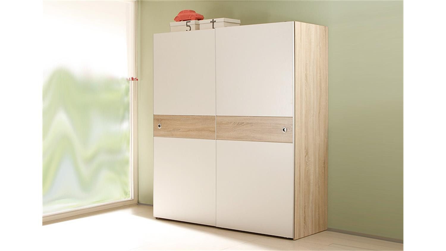 Dieser Kleiderschrank mit Schwebetüren ist aus dem Jugendzimmer Programm WIKI. Der 170 cm breite Schrank in Sonoma Eiche hat zwei weiße Türen, hinter denen sich jeweils eine Boden und eine Kleiderstange befinden. Viel Stauraum für Ihre Kleidung.