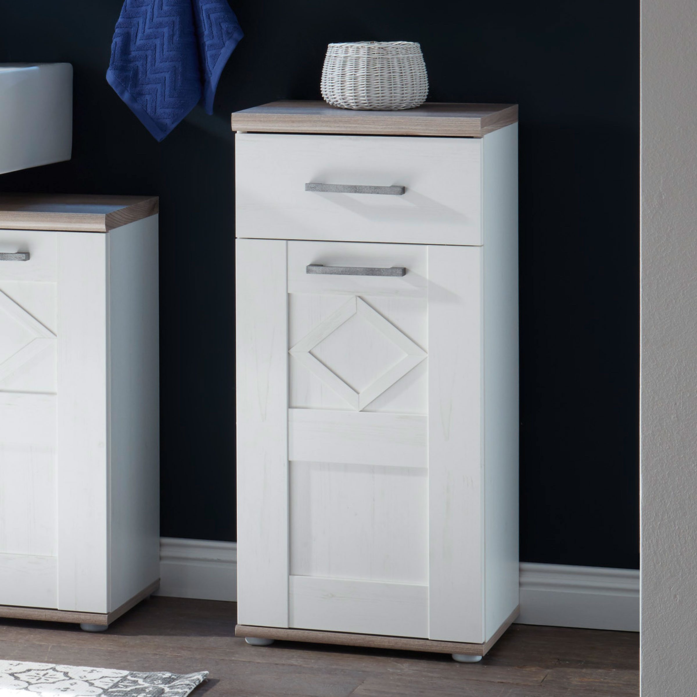 Der Korpus sowie die Ober- und Unterböden in Nelson-Dekor mit melaminbeschichteter Oberfläche unterstreichen die edle Optik. Mit einer Tür und einem Schubkasten bietet die Badkommode Platz, um Ordnung zu schaffen.