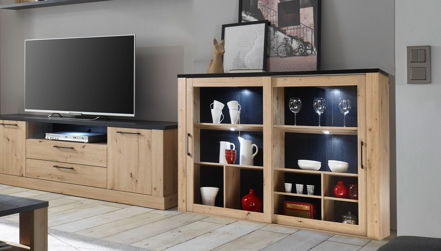 Die Fronten und der Korpus in Artisan Eiche Dekor verleihen dem Schrank MOREL eine warme und natürliche Ausstrahlung. Der Oberboden in Schwarz Dekor setzt einen stilvollen Kontrast und verleiht dem Ganzen eine moderne Note.