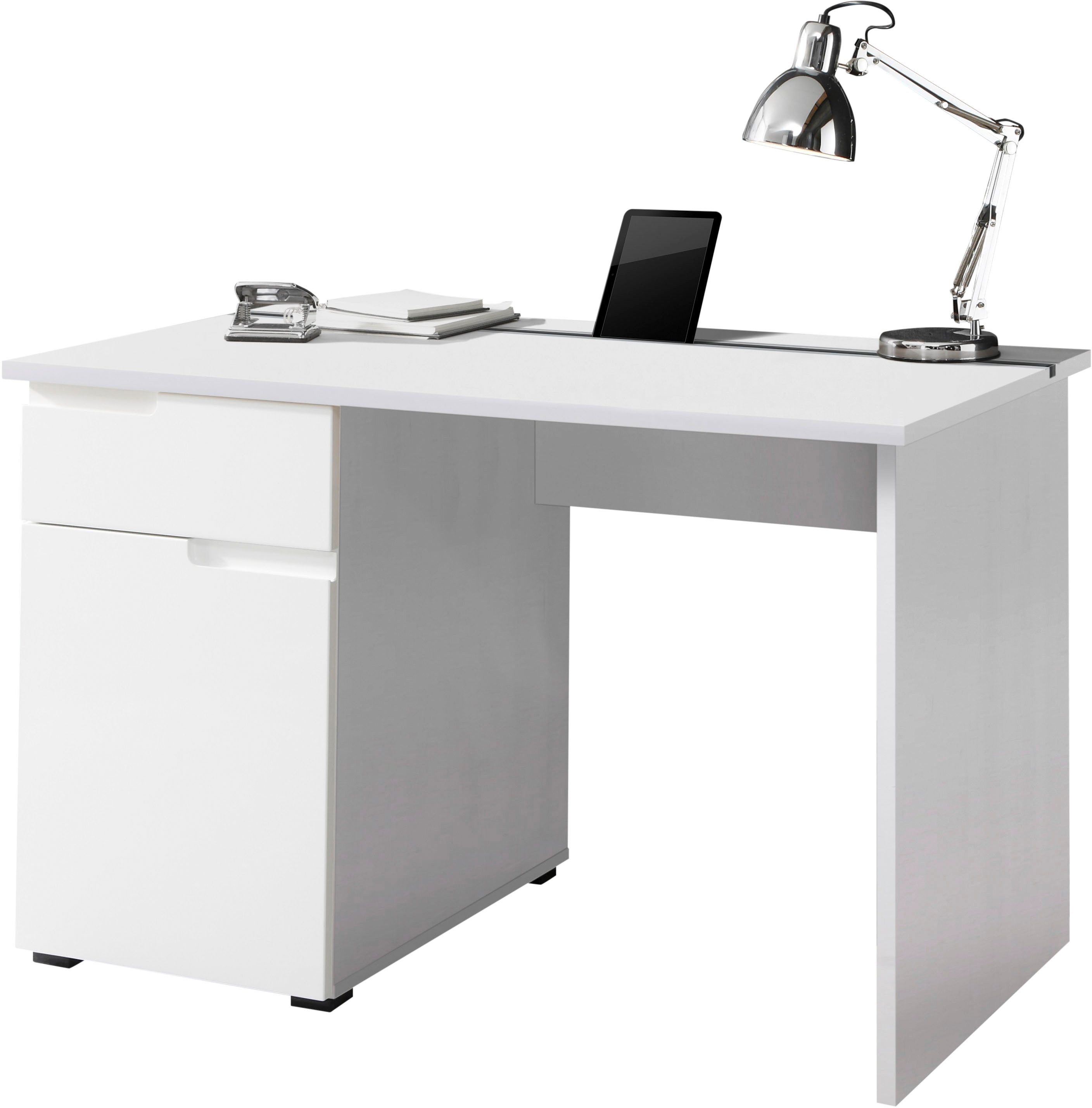 Wissenswertes | Je nach Breite mit 1 bzw. 2 Türen & 1 bzw. 2 Schubkästen, 1 Einlegeboden verstellbar Schreibtischplatte mit Kunststoffprofil zum Aufstellen von Tablets und Smartphones Schubkästen und Türen mit Griffmulden Tischplatte und Korpus in weiß matt Tür und Schubkasten in weiß hochglanz |