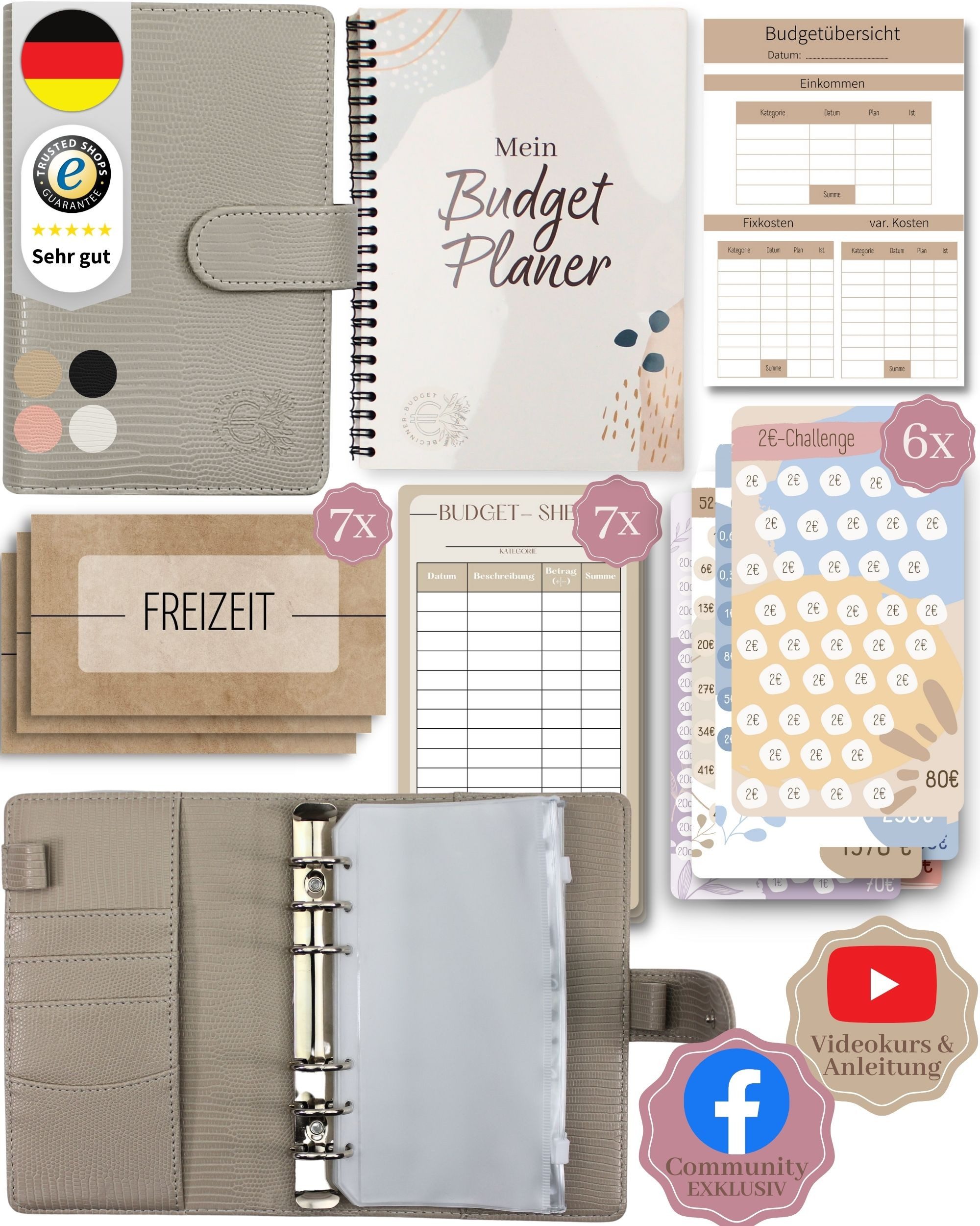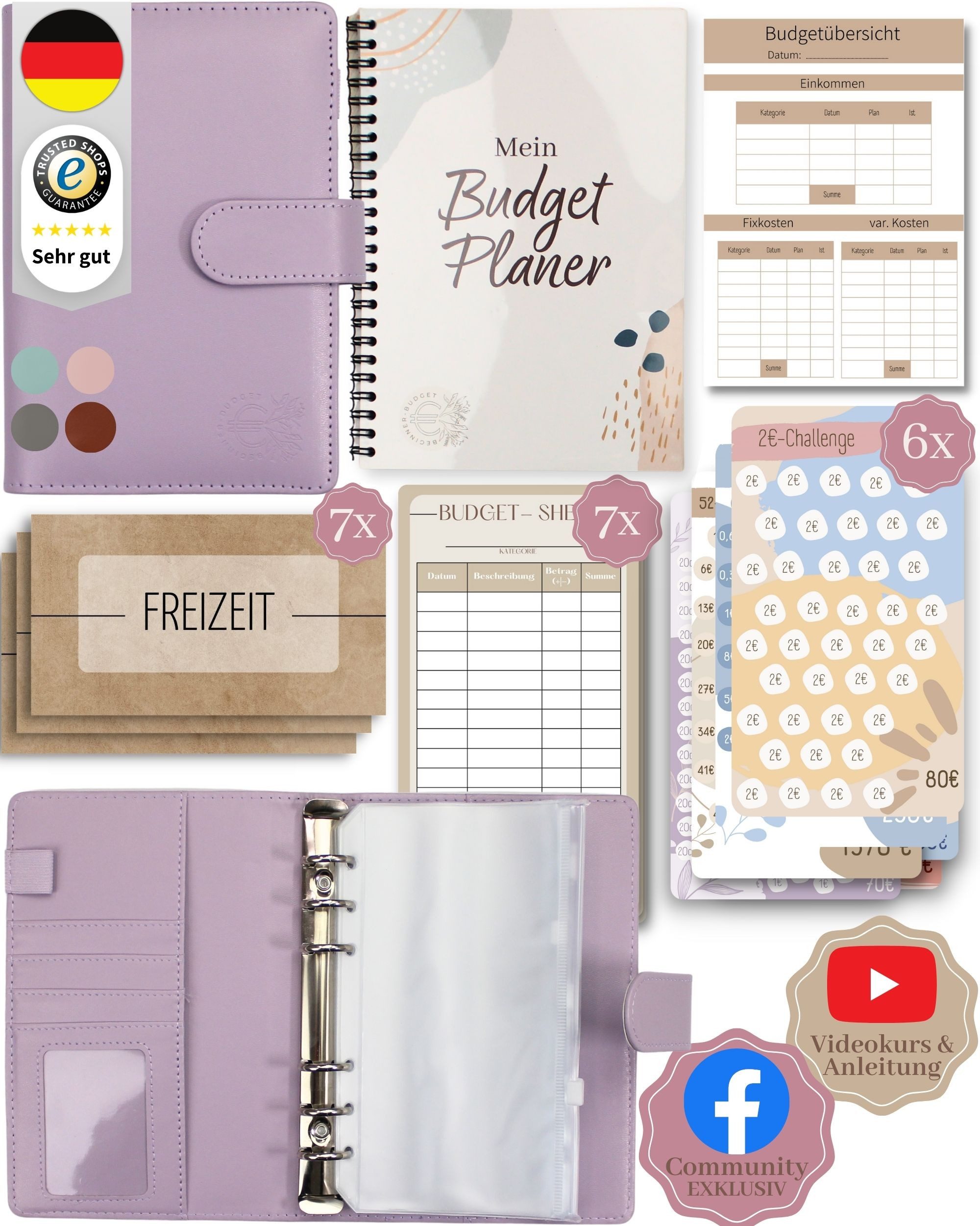 Ausstattung | 1x Binder Personal A6, 1x Budget Planner (Haushaltsbuch), 1x Budgetübersicht, 7x Dashboards (Категории), 10x Budget Sheets, 6x Spar-Challenges, Kostenloser Videokurs, Anleitung, 1x Bargeld-Tracker |